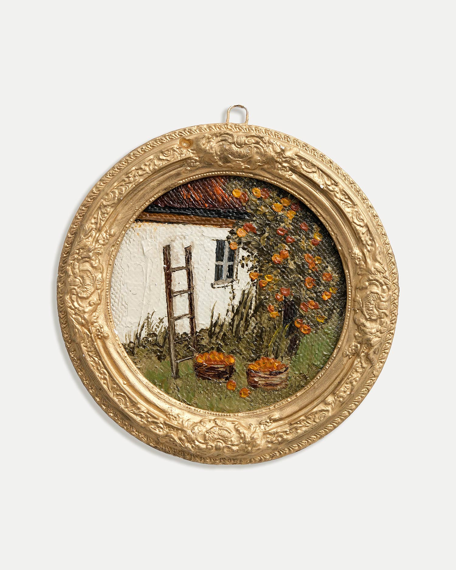Небольшой двор, дом, лестница и корзины с плодами создают образ знакомого состояния: когда день прожит, когда есть результат, когда вокруг - своё.