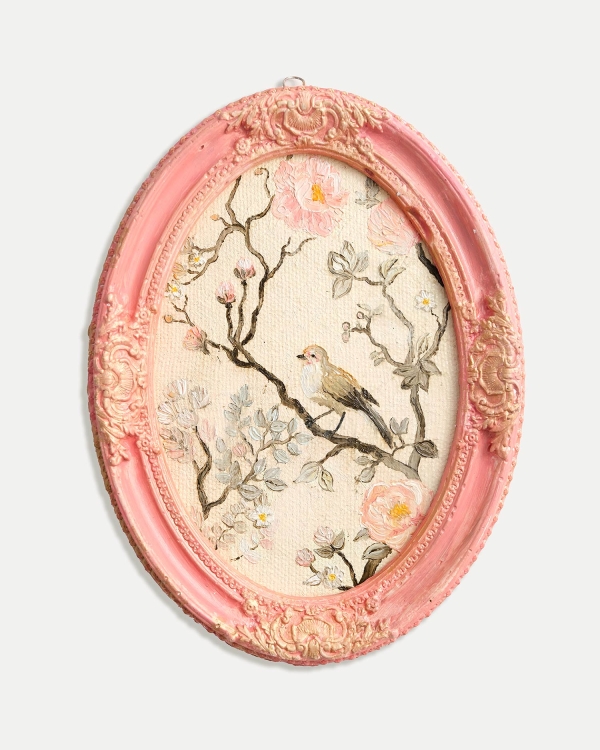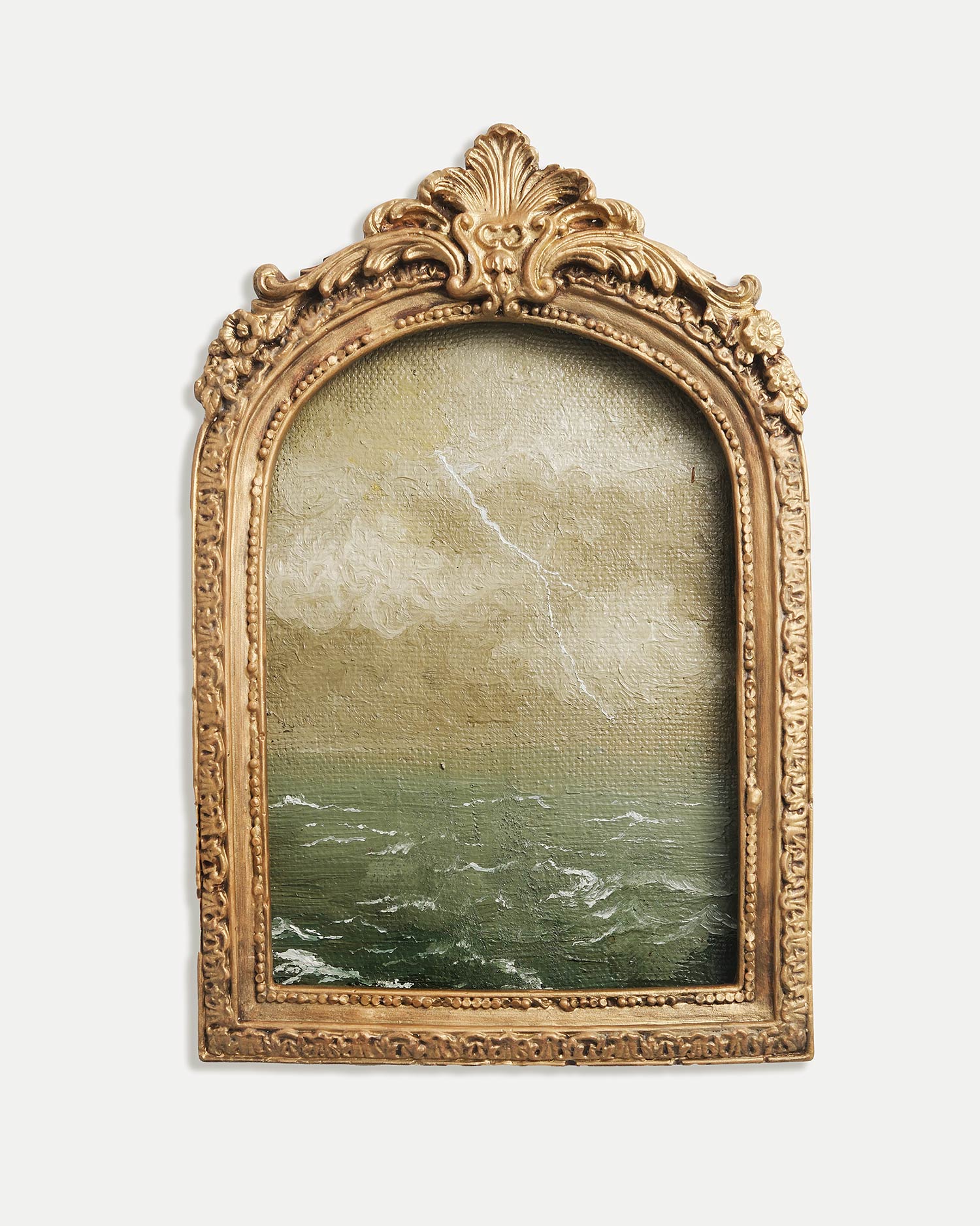Рельефная гипсовая рамка делает работу похожей на найденный фрагмент памяти - что-то, к чему возвращаются не глазами, а состоянием.