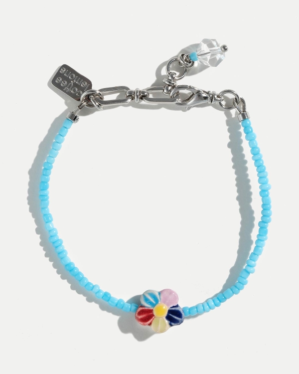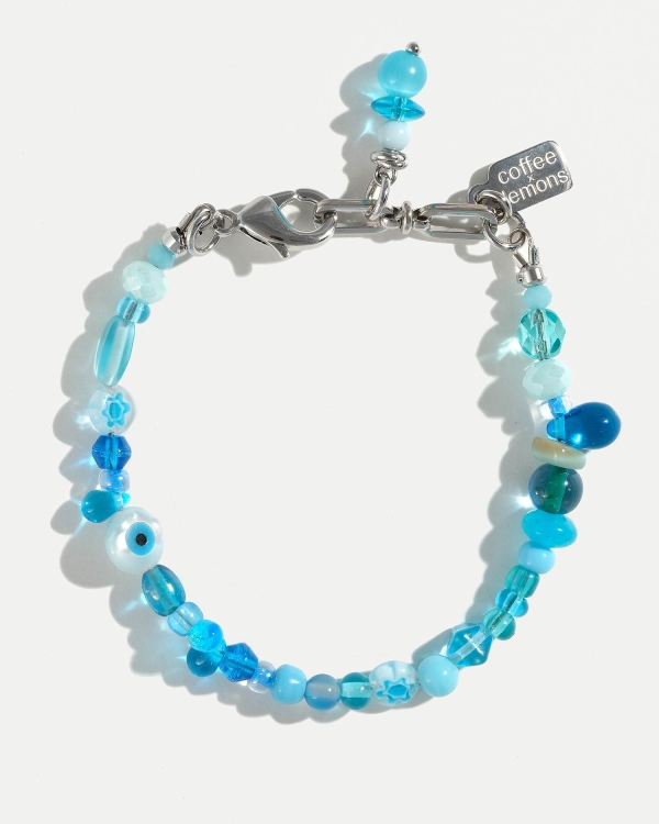 Браслет выполнен из ювелирного сплава, покрытого родием, бисера, бусины лэмпворк и чешского стекла.