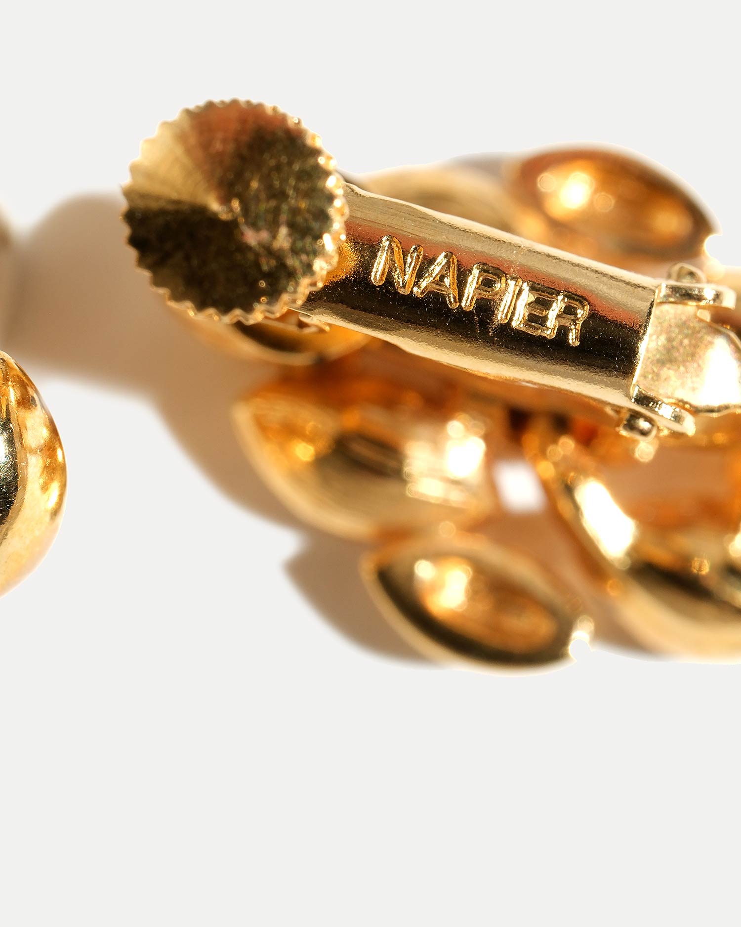 Золотистые винтажные клипсы Napier выполнены в скульптурной вертикальной композиции с чередованием гладких золотых элементов и прозрачных кристаллов огранки marquise («лодочка»). Чёткая симметрия и вытянутая форма создают архитектурный силуэт и мягкую игру света при движении.