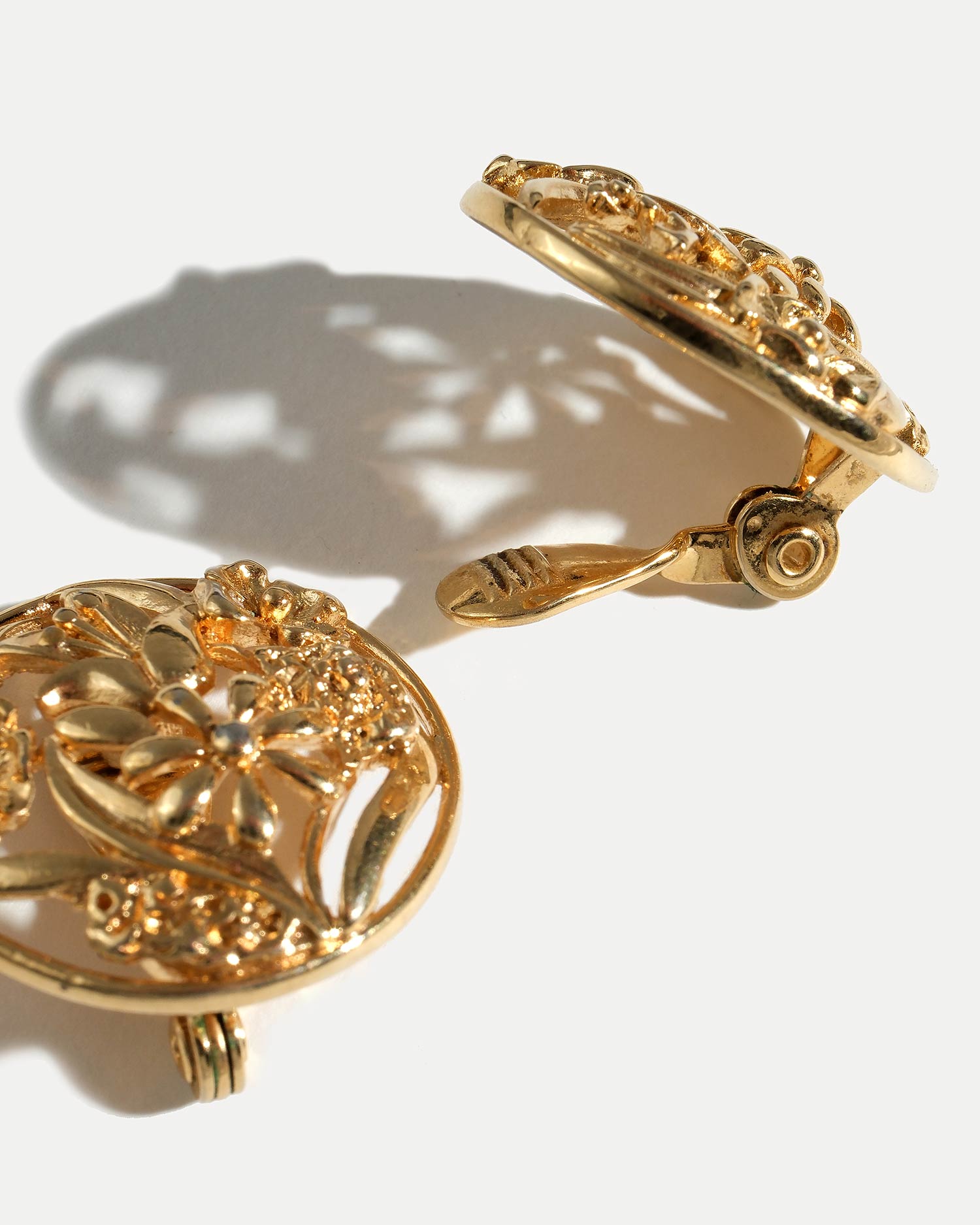 Золотистые винтажные клипсы Monet выполнены в круглой ажурной форме с объёмной флоральной композицией внутри. Рельефные цветы, листья и изогнутые стебли заключены в аккуратную окружность, создавая ощущение миниатюрного золотого медальона.