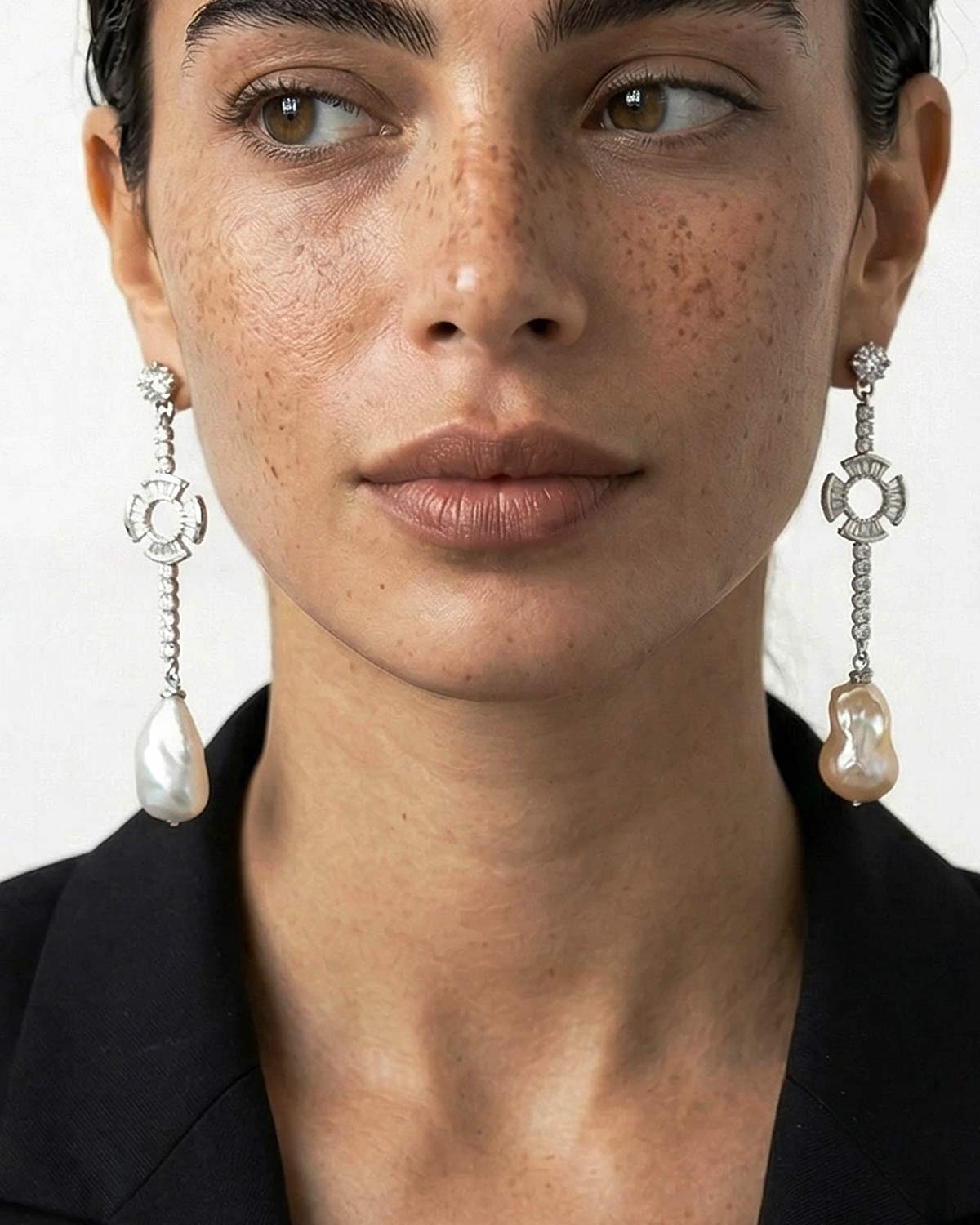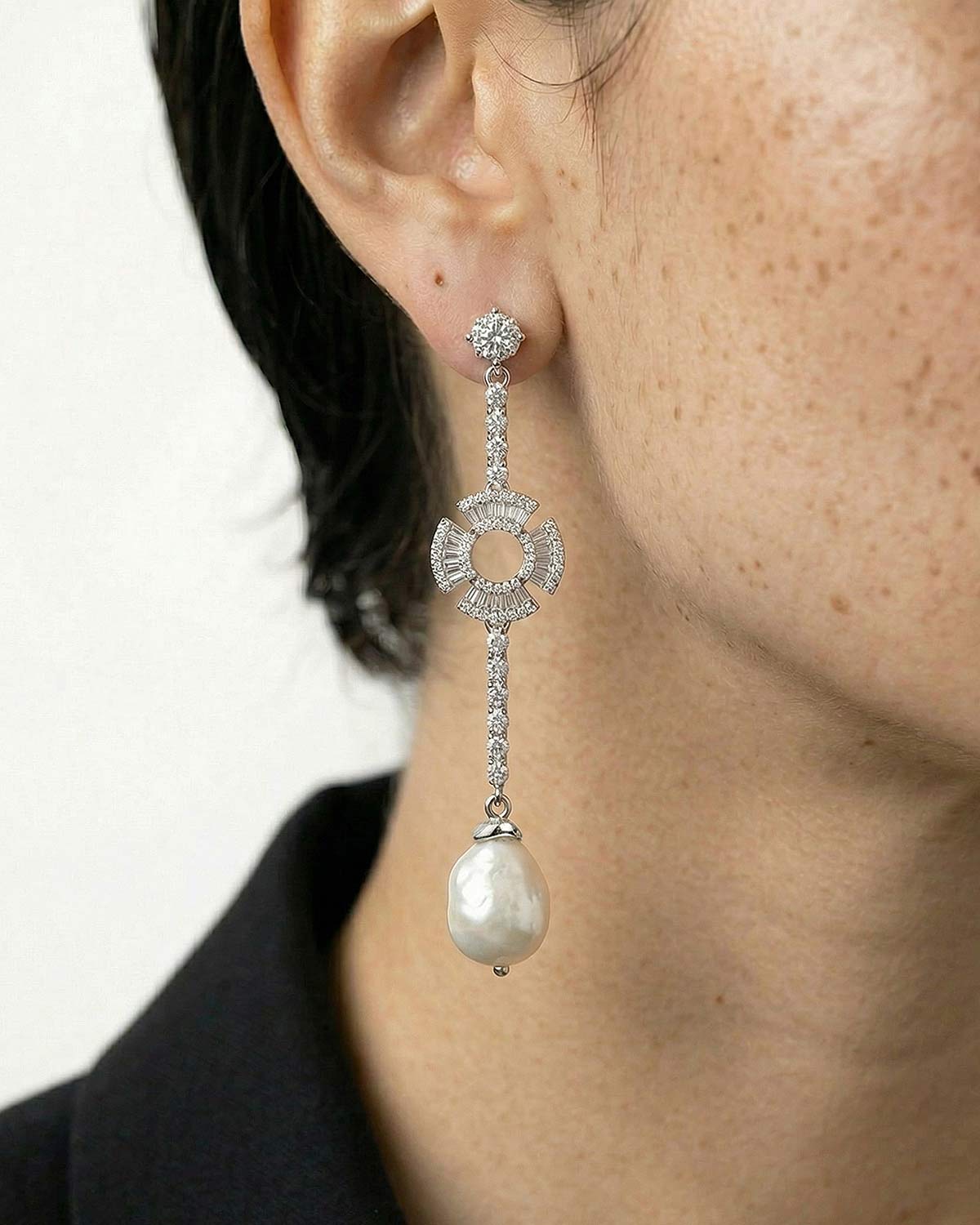 Серьги выполнены из ювелирного сплава, покрытого родием, фианитов и барочного жемчуга.