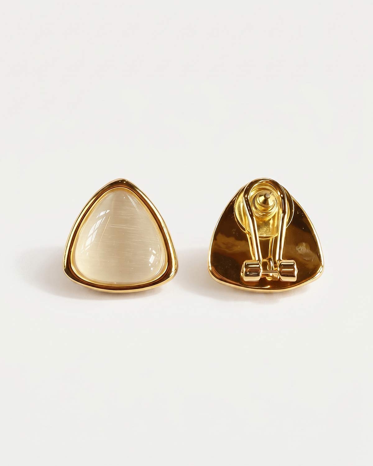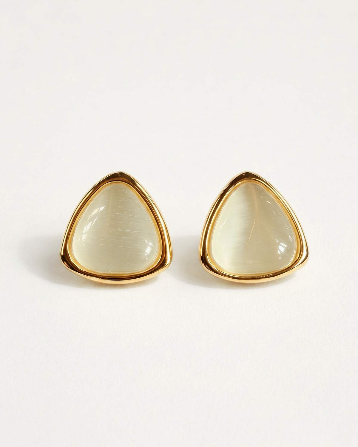 Кабошоны с эффектом «кошачьего глаза» красиво раскрывают светлый жемчужно-молочный оттенок и создают эффект мягкого внутреннего свечения. Золотистая оправа добавляет тепла, подчеркивает чистоту цвета и делает модель визуально более собранной и статусной.