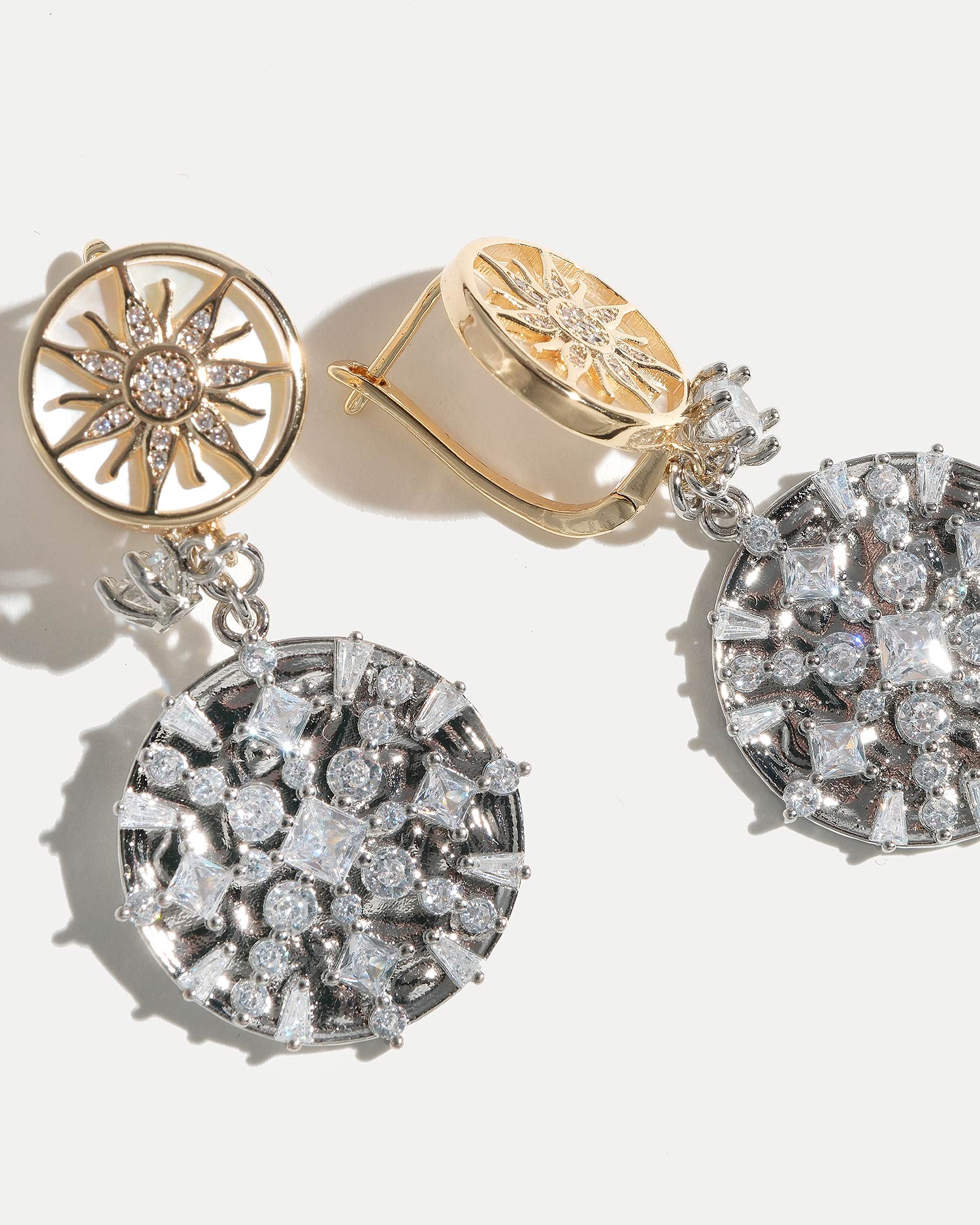 Серьги выполнены из ювелирного сплава, покрытого родием, фианитов, ювелирного сплава, покрытого 18К золотом, и перламутра.