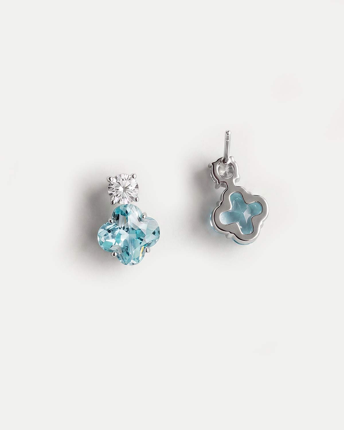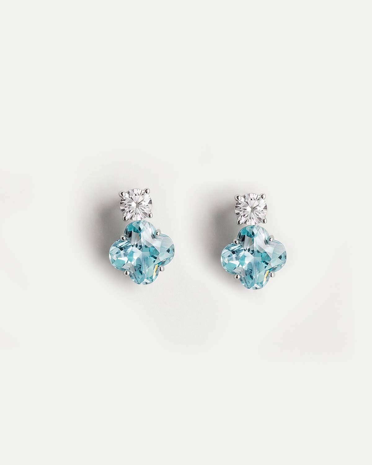 Серьги выполнены в лаконичной композиции из двух вставок: круглого прозрачного фианита и более крупного голубого фианита с мягким четырехлепестковым силуэтом. Серебристая оправа подчеркивает чистоту цвета, а сочетание прозрачного блеска и нежно-голубого оттенка придает модели легкое, свежее и деликатно сияющее звучание.