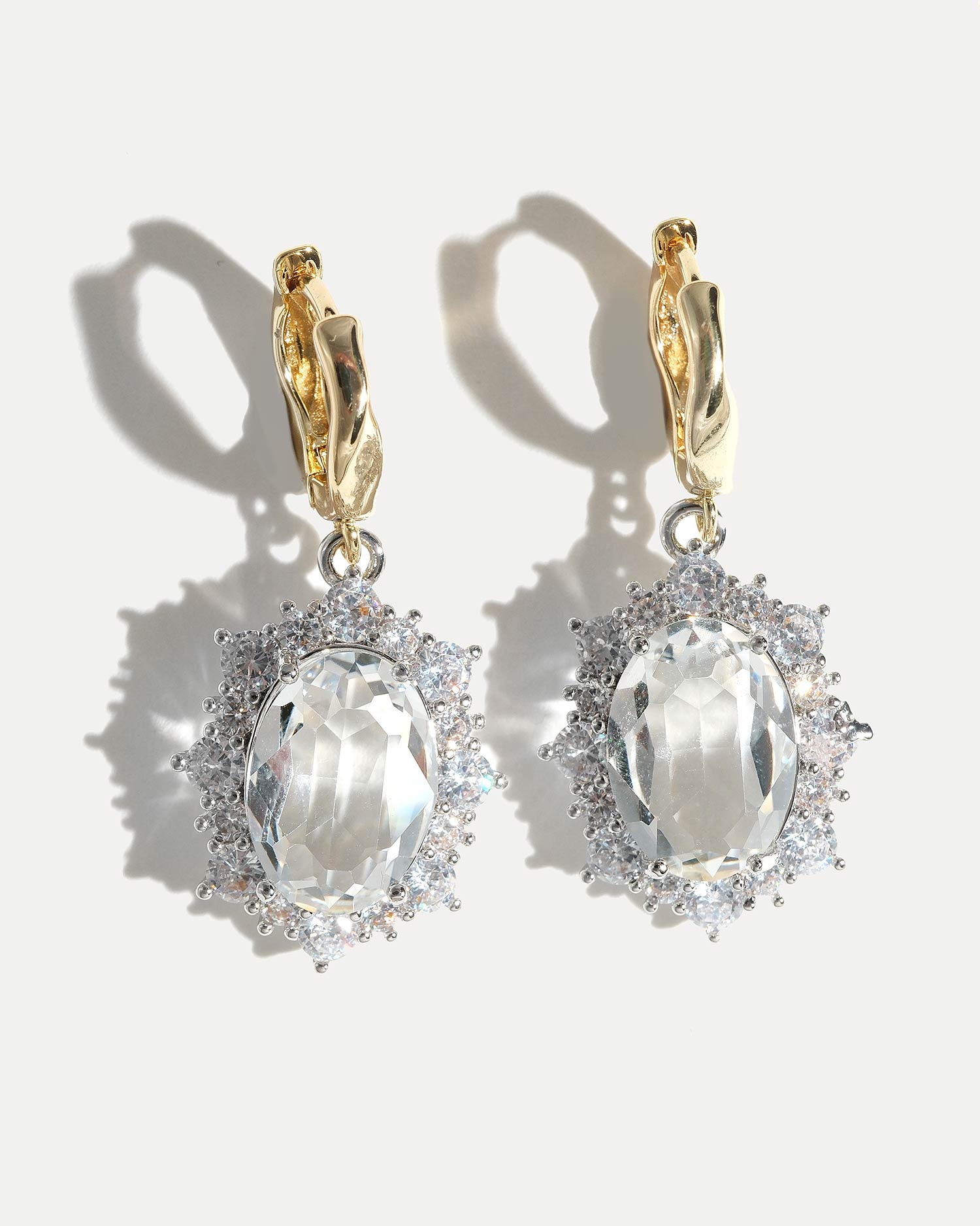 Серьги выполнены из ювелирного сплава, покрытого родием, чешского стекла, фианитов и ювелирного сплава, покрытого 18К золотом.