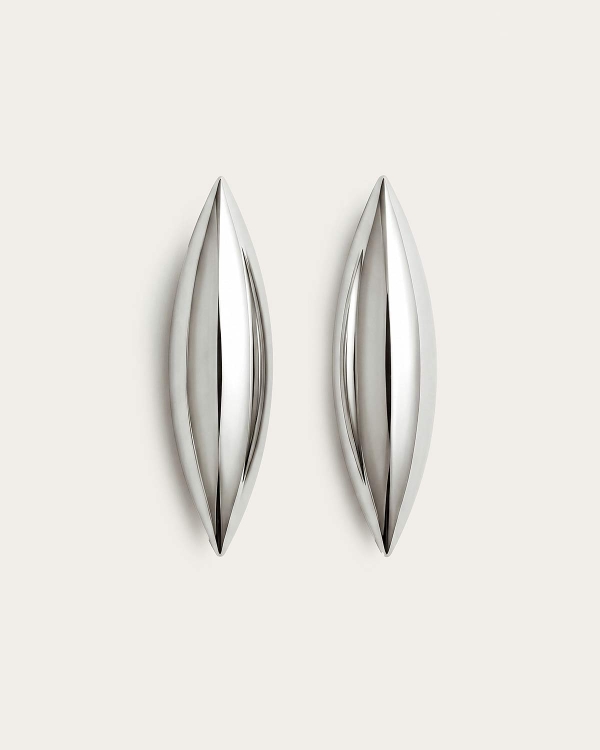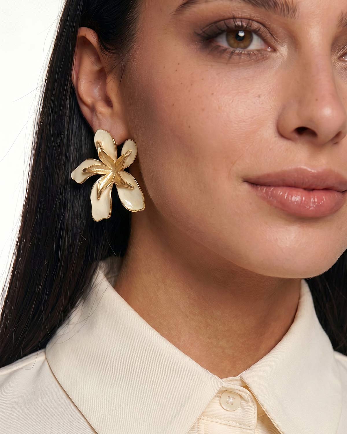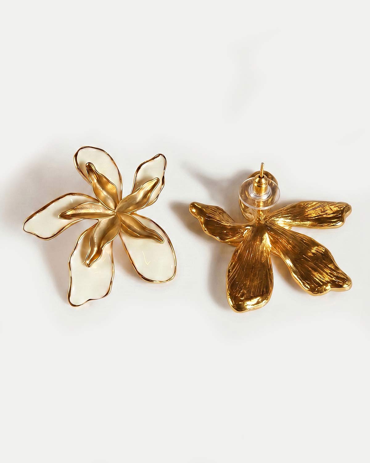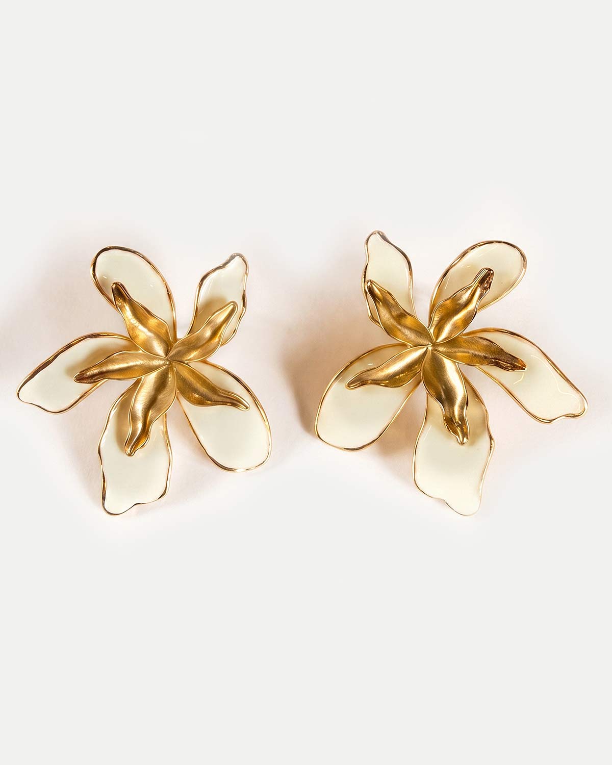 Серьги выполнены в форме стилизованного цветка с крупными лепестками, где белая эмаль сочетается с золотистыми металлическими элементами. Объемная композиция и мягкая пластика лепестков делают модель выразительной в образе, а контраст глянцевой эмали и теплого металла придает серьгам декоративное и собранное звучание.