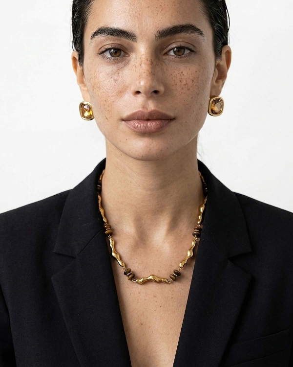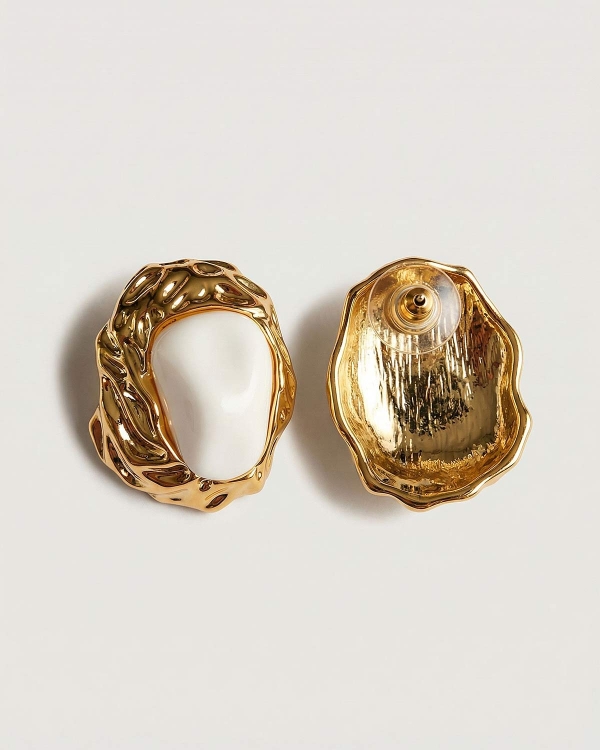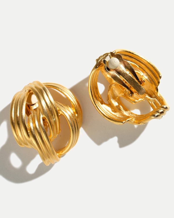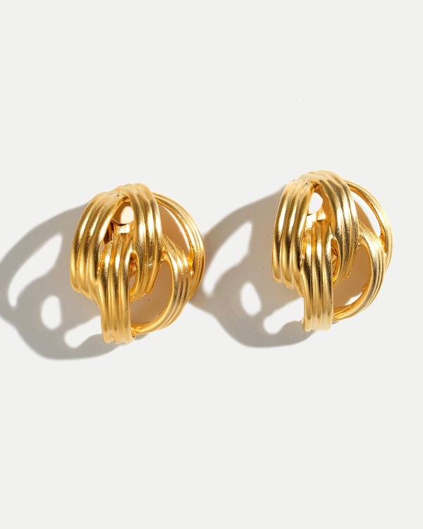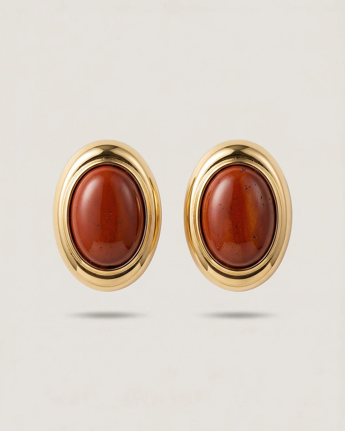 Объемная овальная форма, гладкая оправа и крупные центральные кабошоны отсылают к эстетике украшений в стиле 80-х. Теплый золотистый металл подчеркивает насыщенность терракотового оттенка, а сочетание гладкой поверхности и крупного размера придает серьгам характер, декоративность и уверенное винтажное звучание.