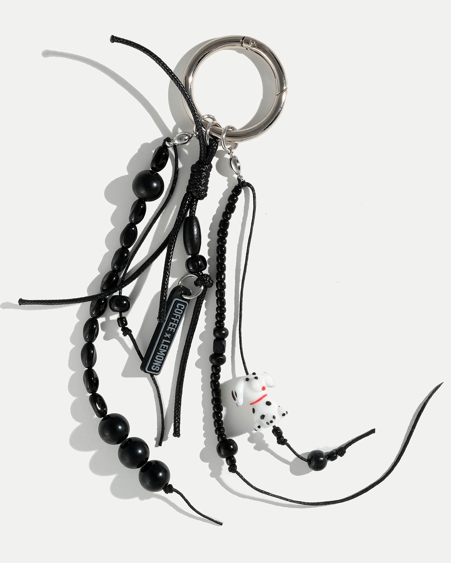 Брелок выполнен из шнура, ювелирного сплава, покрытого родием, чешского стекла, деревянных бусин и керамических бусин.