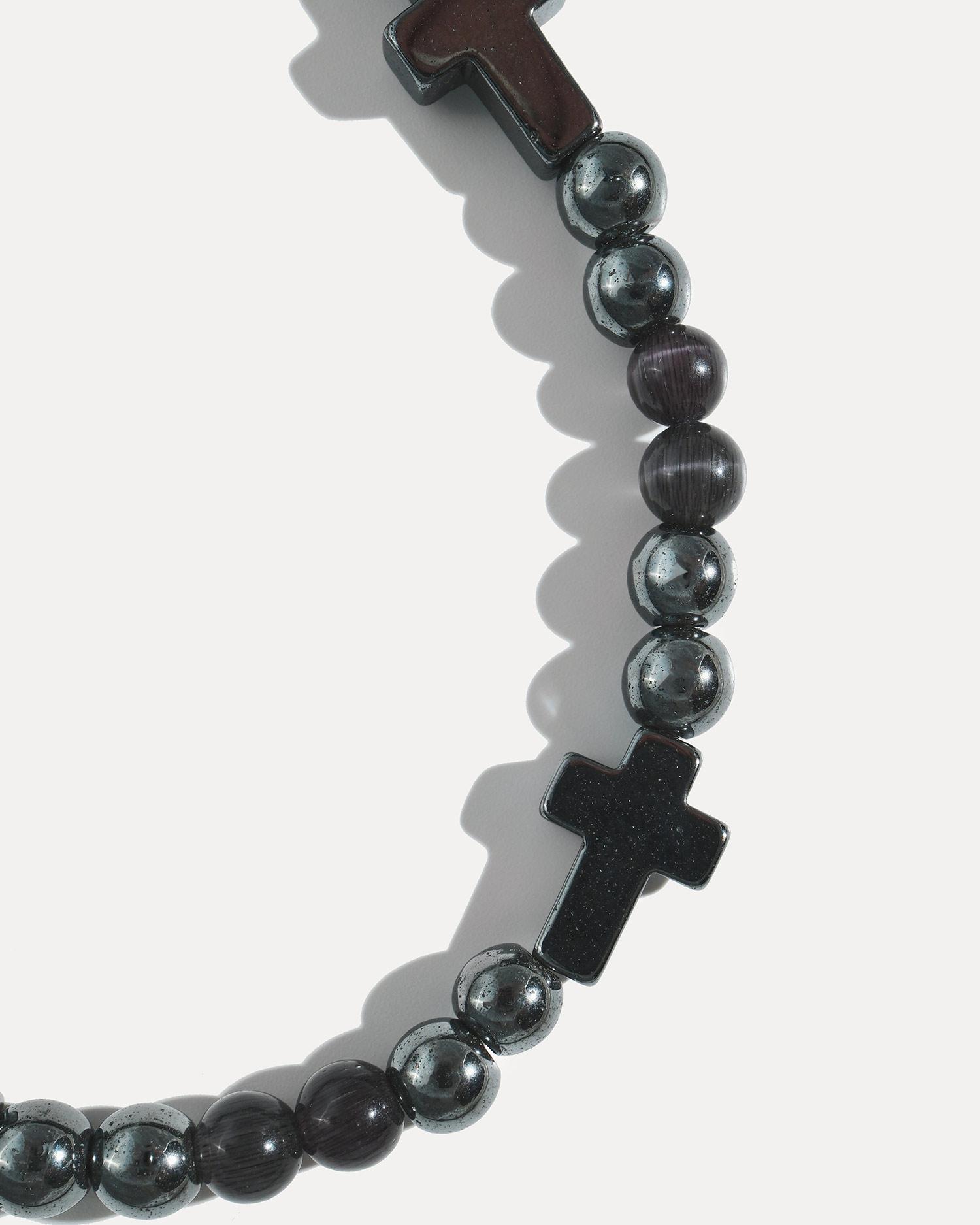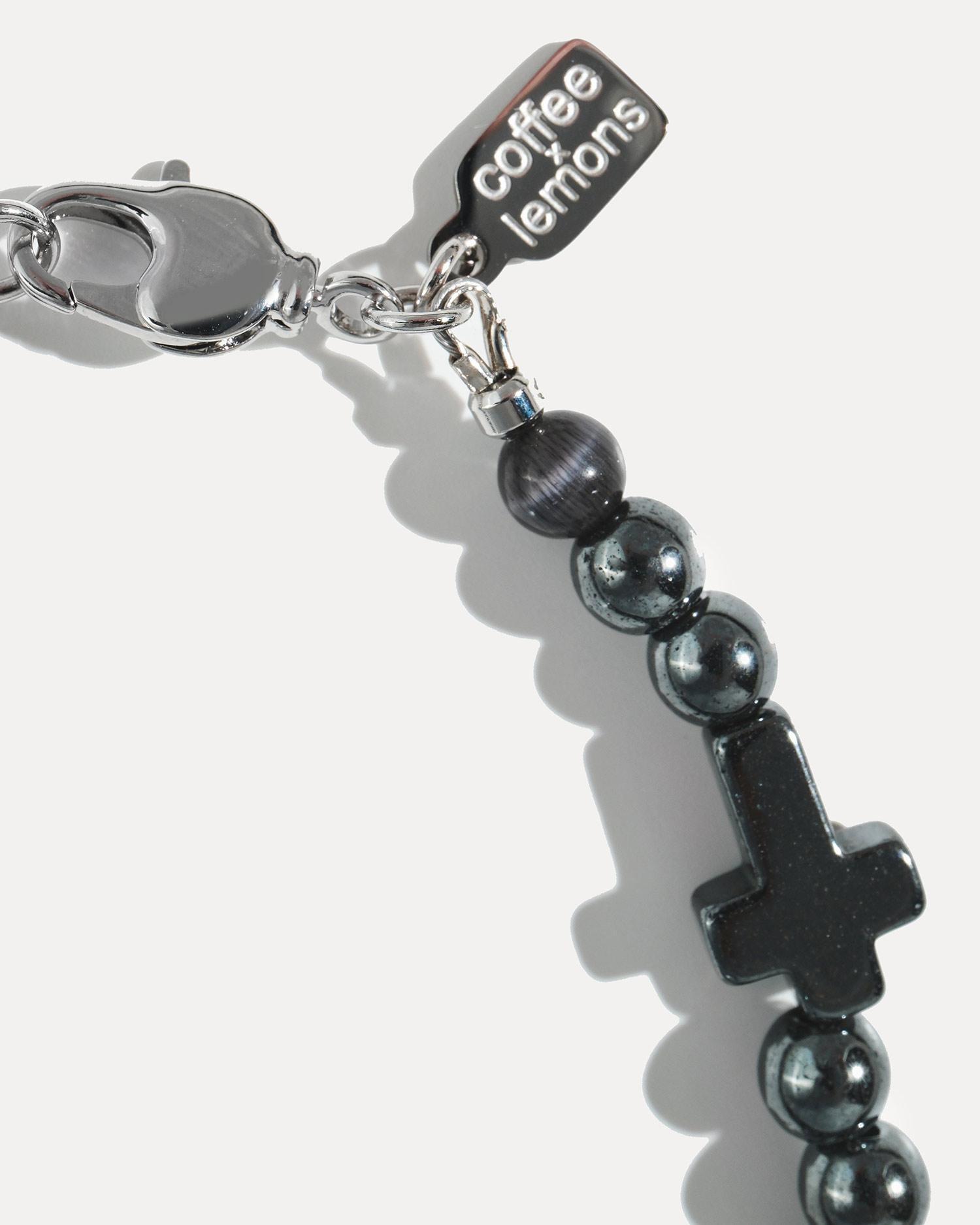Браслет выполнен из гематита, камня кошачий глаз, ювелирного сплава, покрытого родием.
