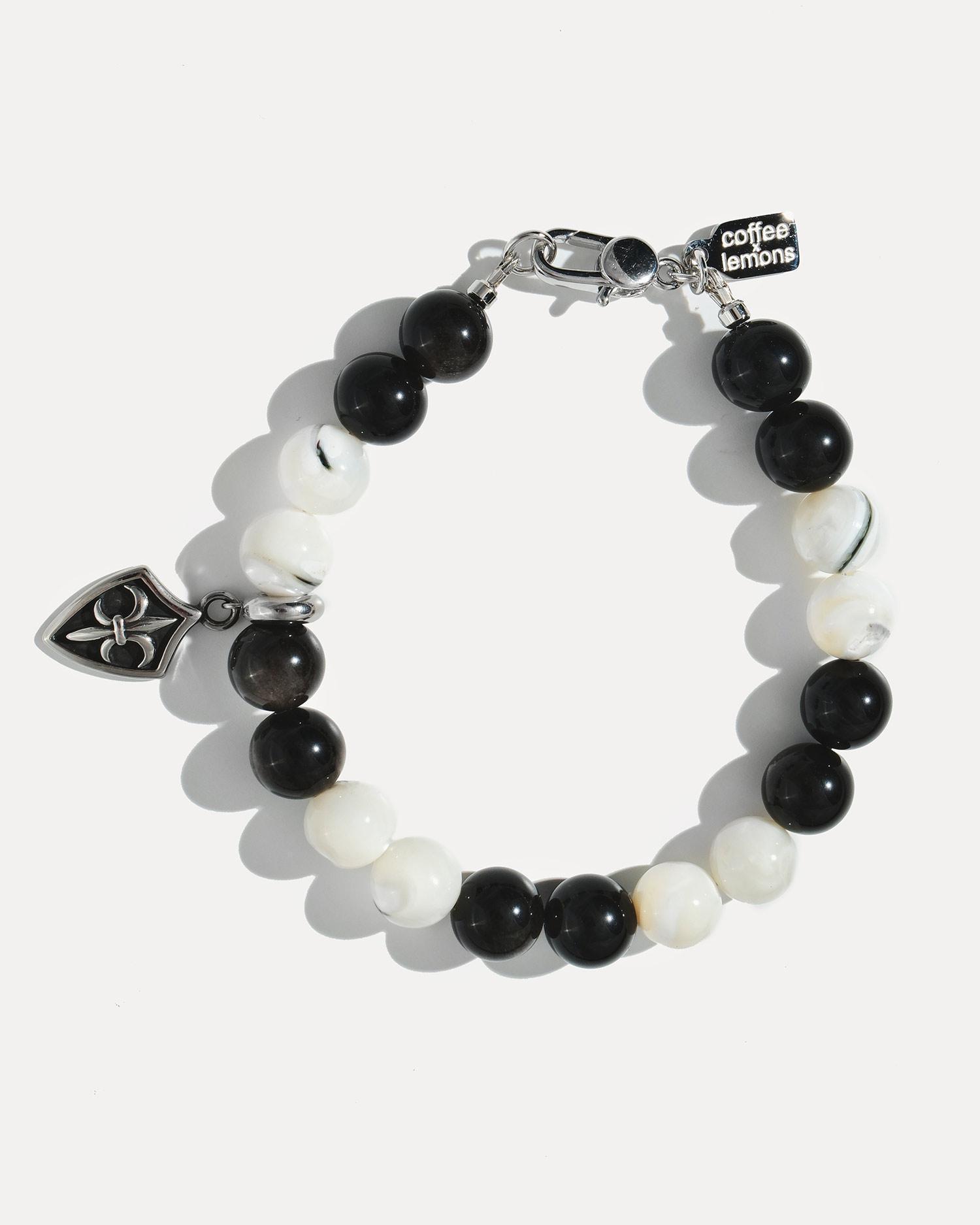 Браслет с подвеской "геральдическая лилия" выполнен из обсидиана, перламутра, металлического сплава с чернением, гематита, и ювелирного сплава, покрытого родием.