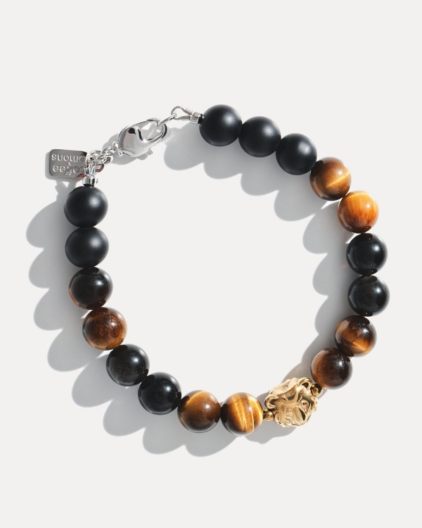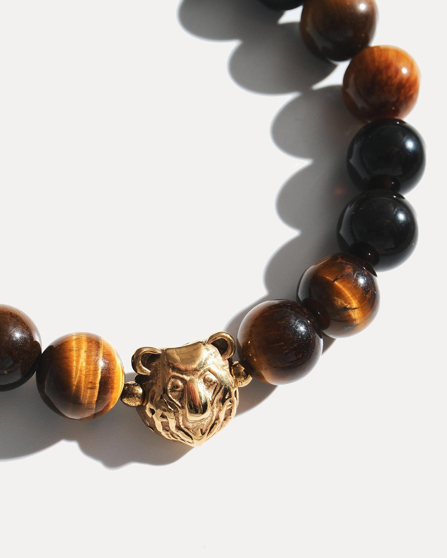 Браслет с медведем выполнен из камня тигровый глаз, обсидиана, шунгита, ювелирного сплава, покрытого 18К золотом, и ювелирного сплава, покрытого родием.