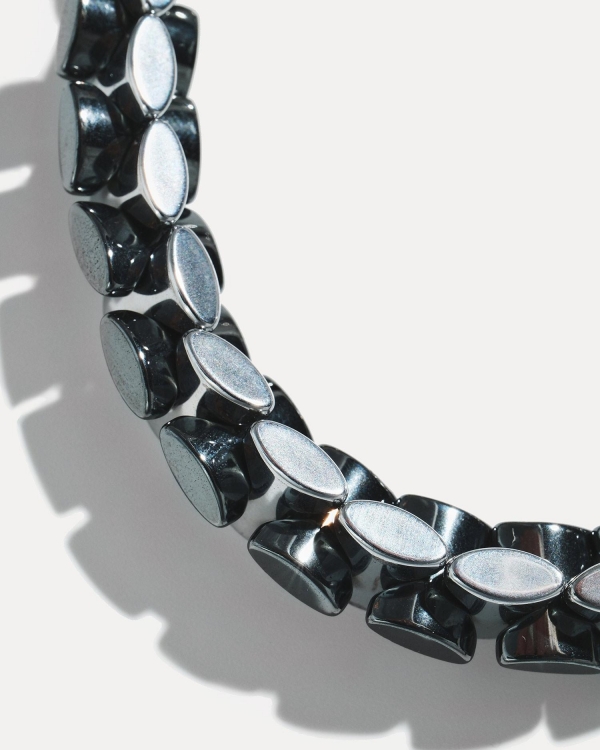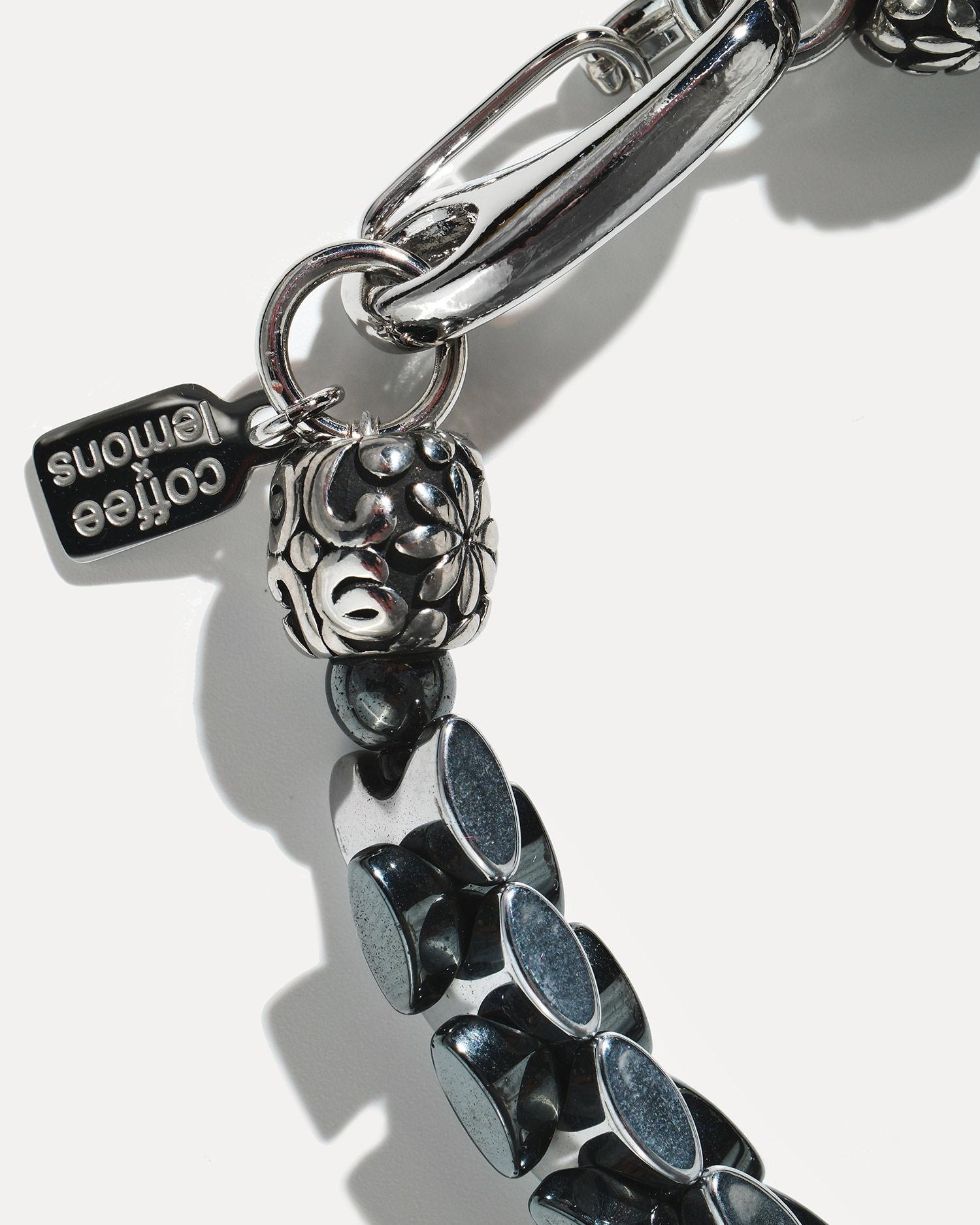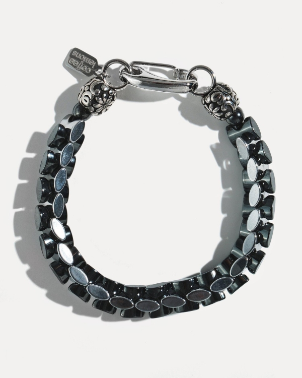 Браслет выполнен из гематита, металлического сплава с чернением, и ювелирного сплава, покрытого родием.