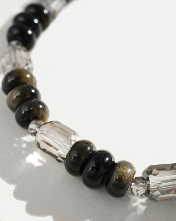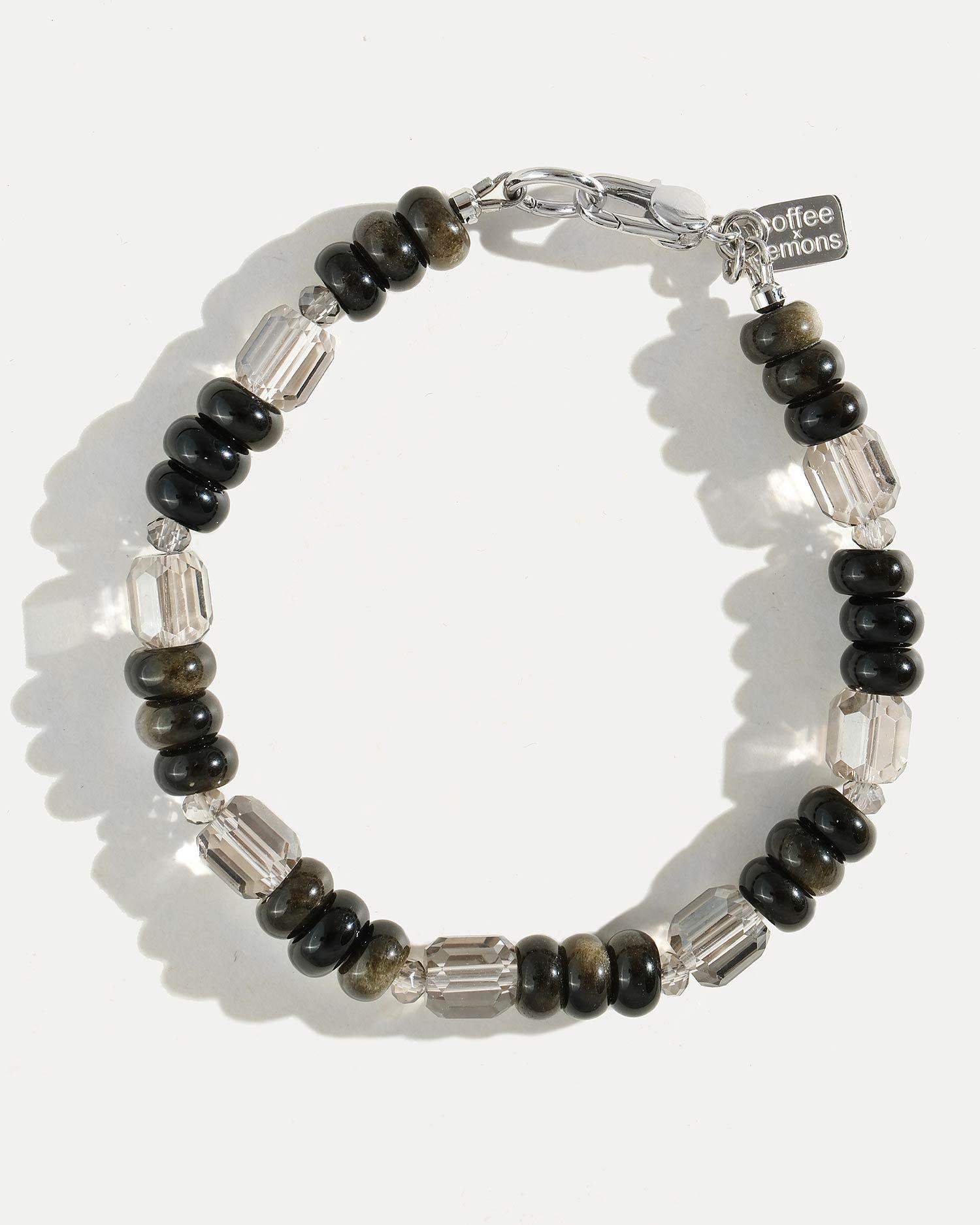 Браслет выполнен из обсидиана, чешского стекла и ювелирного сплава, покрытого родием.
