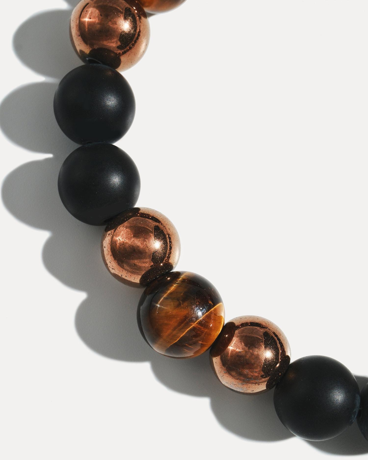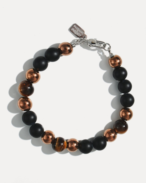 Браслет выполнен из шунгита, гематита, камня тигровый глаз, и ювелирного сплава, покрытого родием.