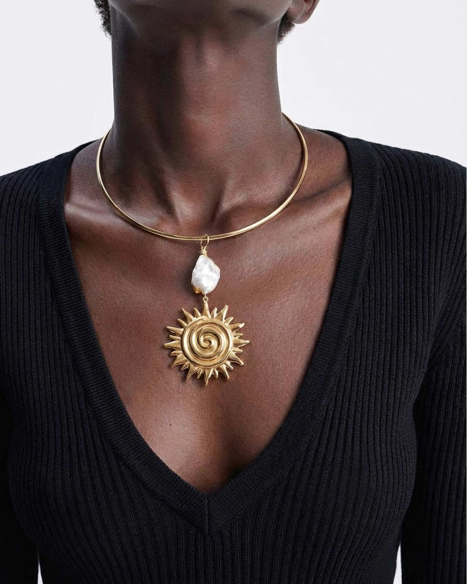 Колье с солнцем выполнено из ювелирного сплава, покрытого 18К золотом, и жемчуга.
