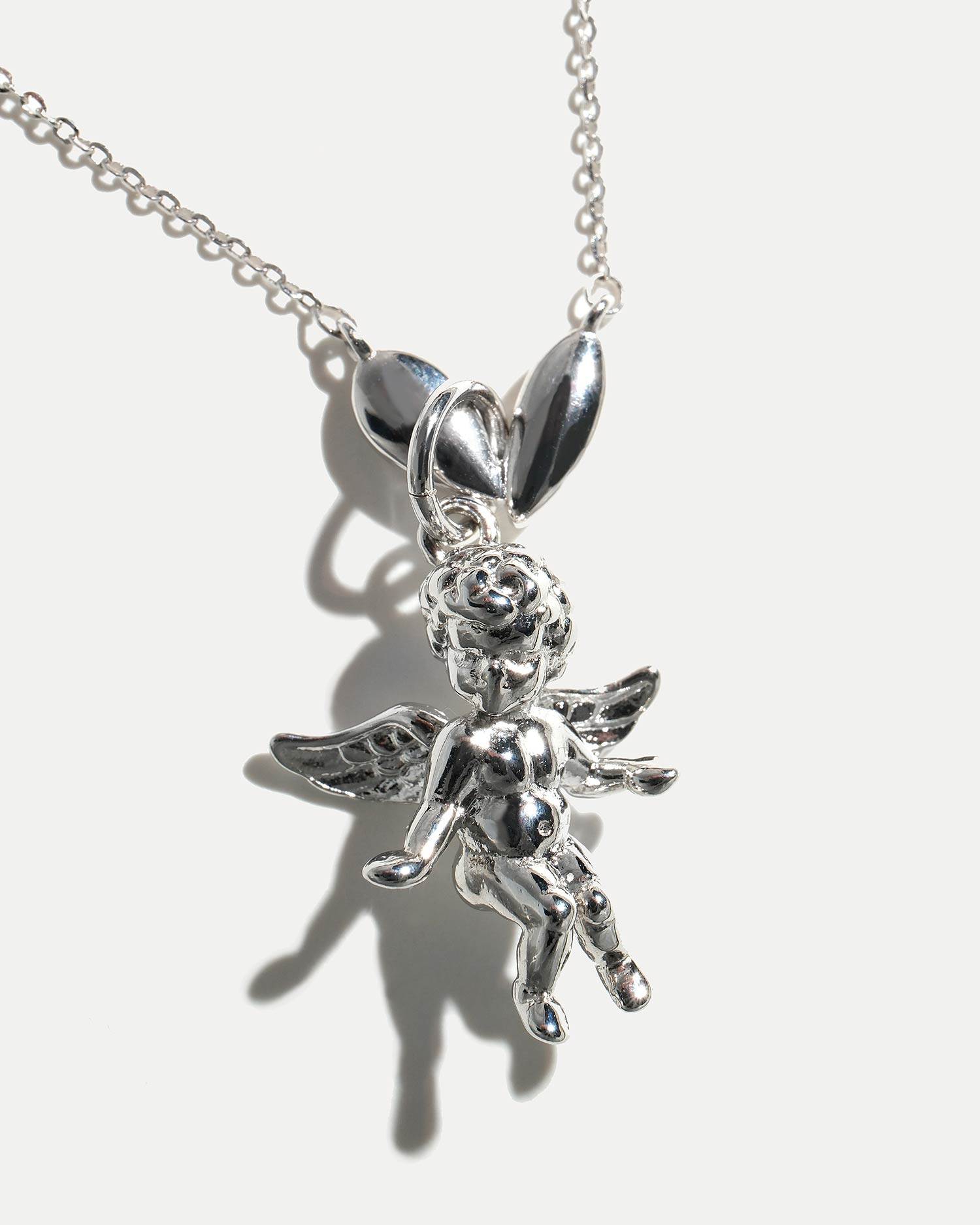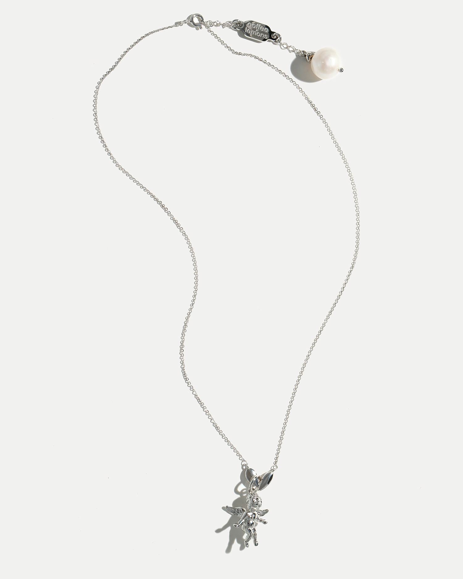 Колье с подвеской в виде ангела выполнено из ювелирного сплава, покрытого родием, и жемчуга.