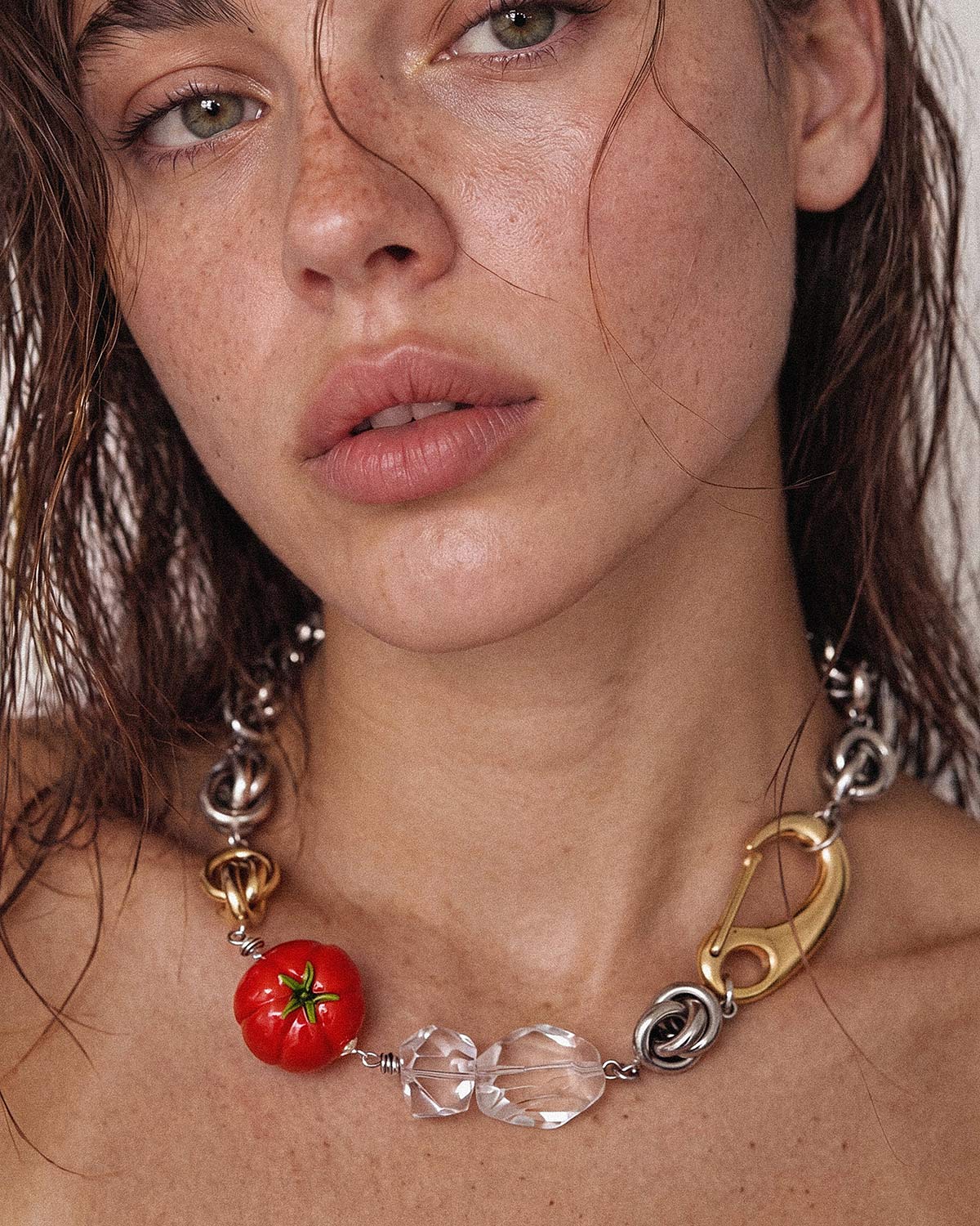 Колье с помидором выполнено из ювелирного сплава, покрытого родием, горного хрусталя и ювелирного сплава, покрытого 18К золотом.