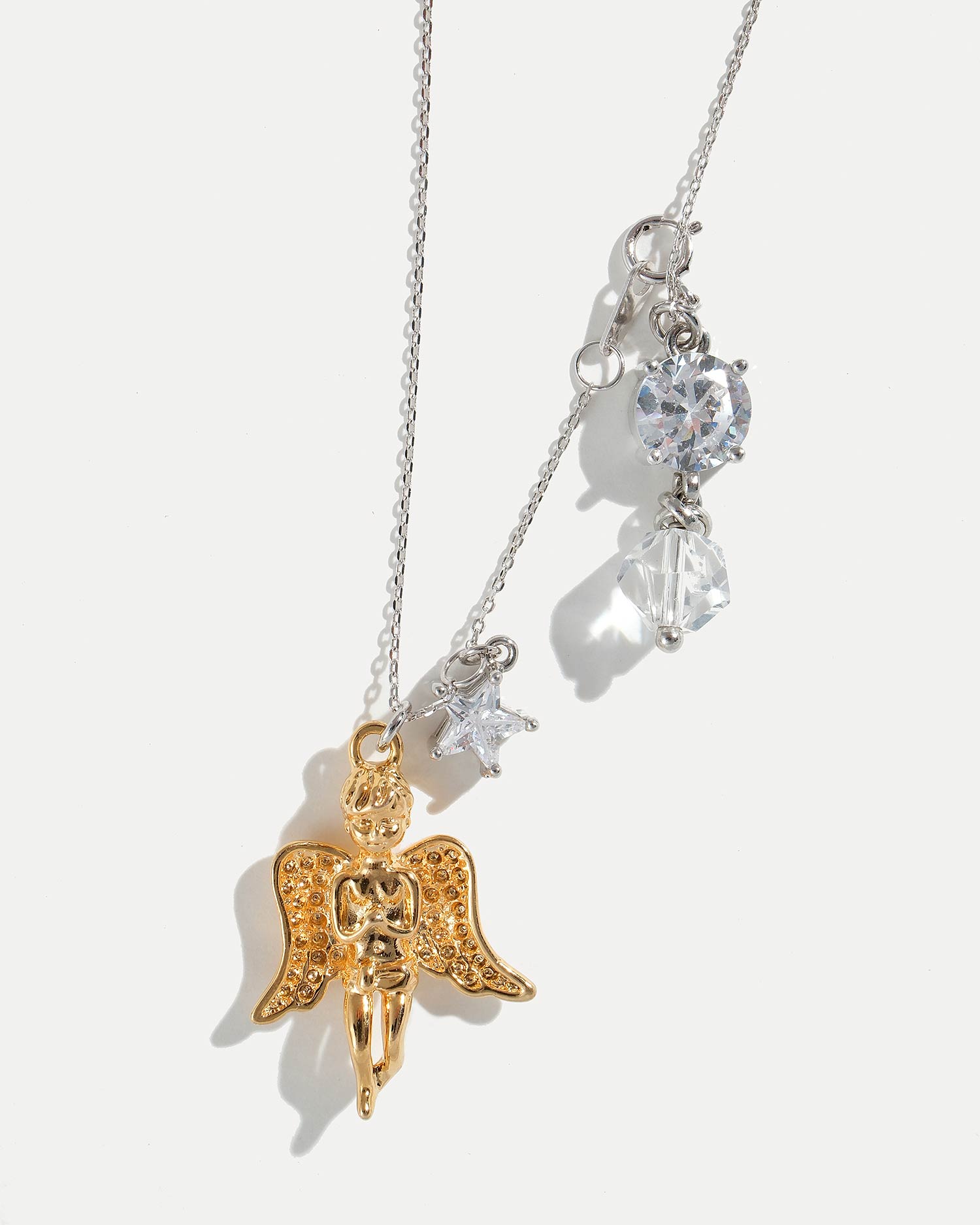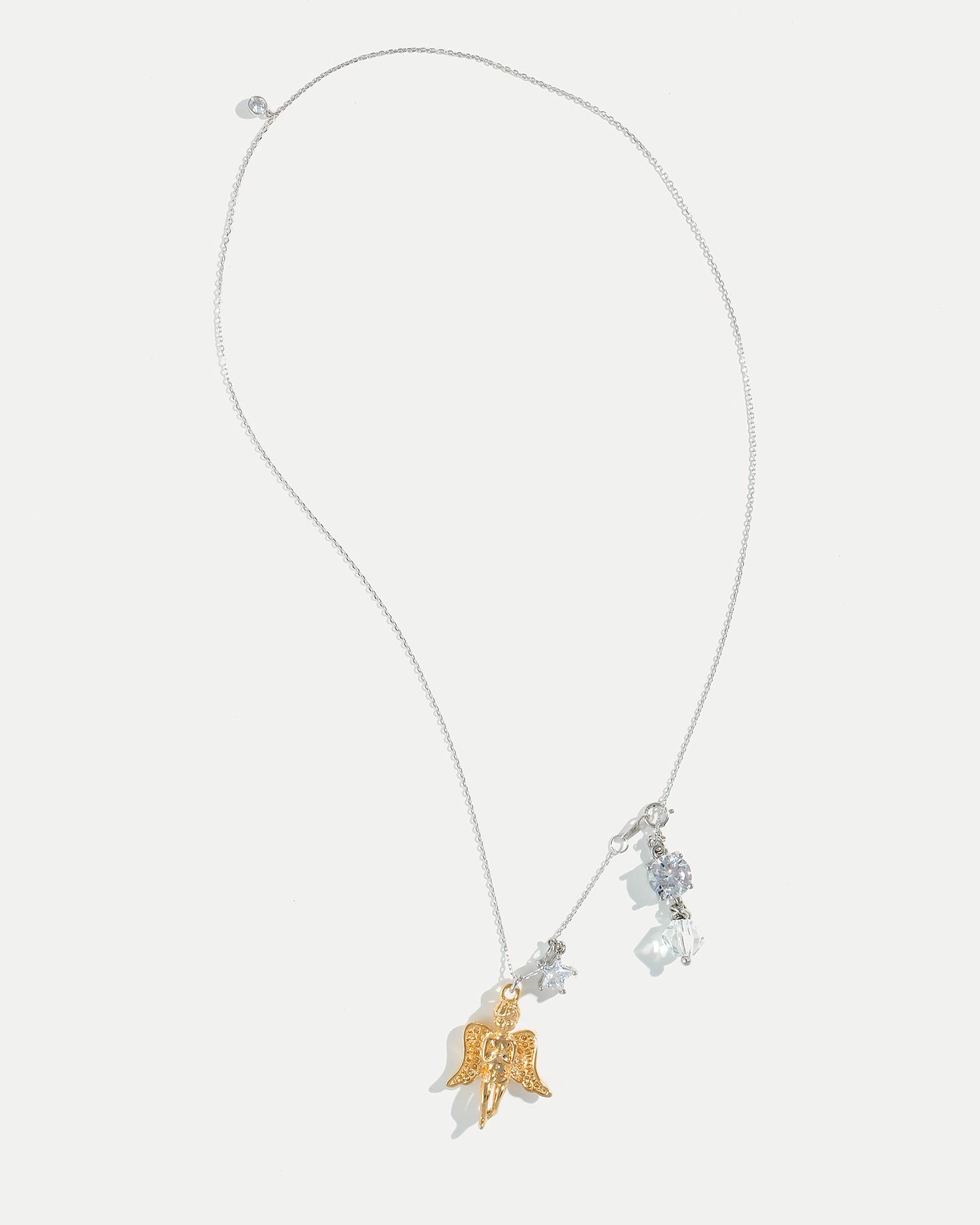Колье с подвеской в виде ангела выполнено из ювелирного сплава, покрытого родием, ювелирного сплава, покрытого 18К золотом, чешского стекла и фианитов.