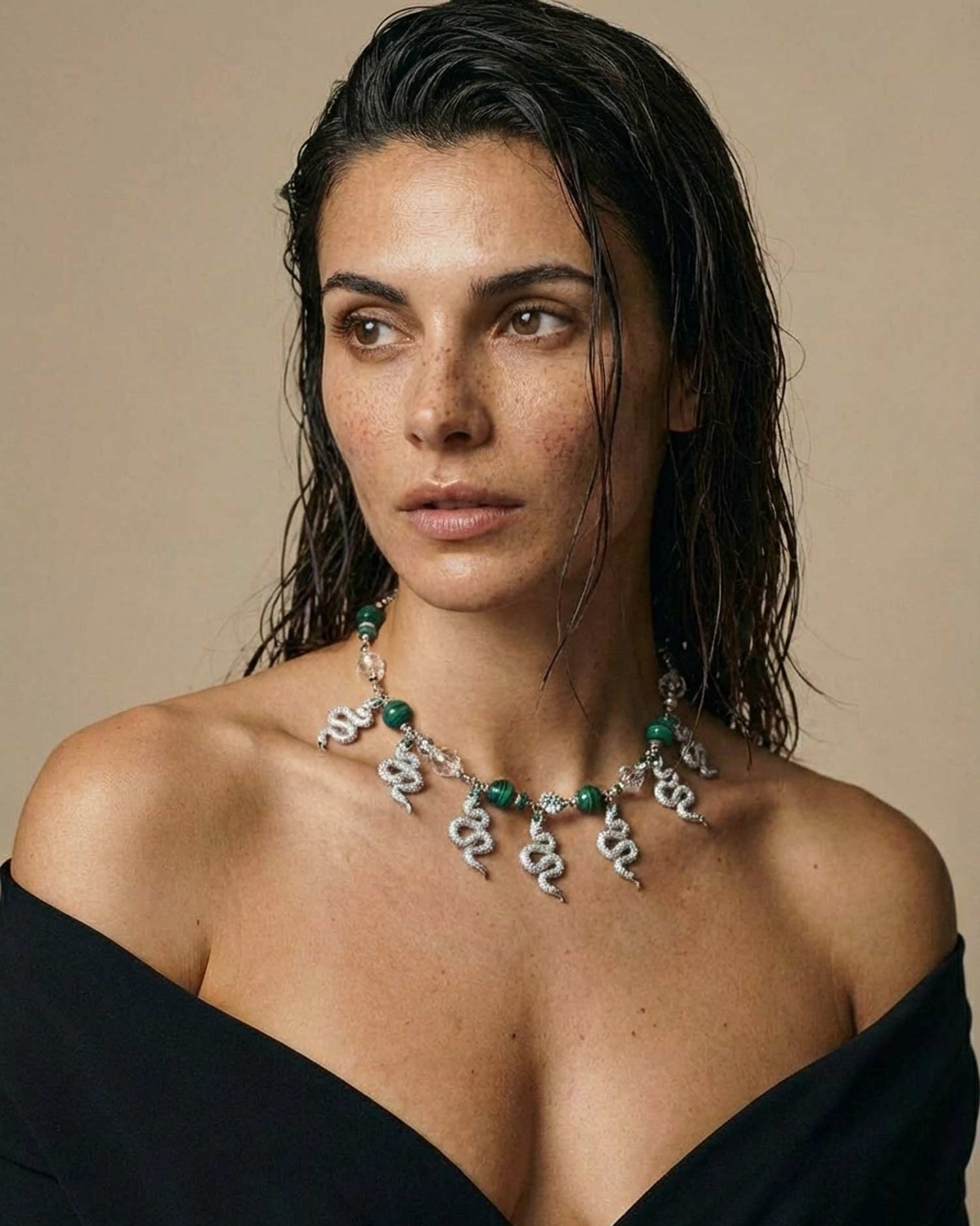 Колье выполнено из малахита, ювелирного сплава, покрытого родием, горного хрусталя, чешского стекла, гематита, фианитов и ювелирного слава, покрытого 18К золотом.