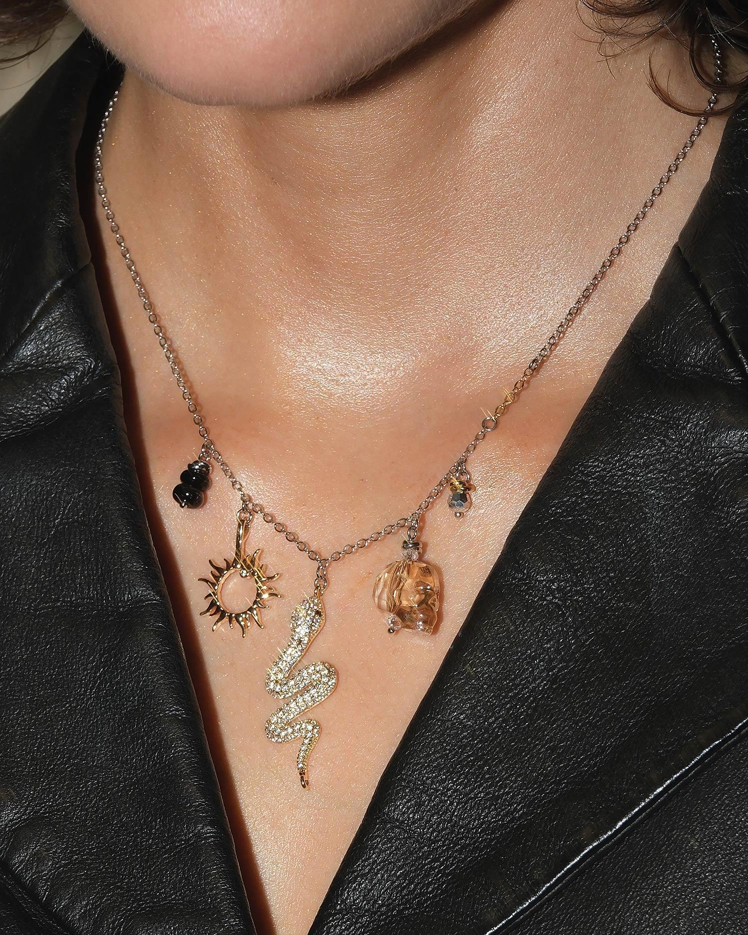 Колье с кристаллом Swarovski в виде черепа выполнено из ювелирного сплава, покрытого родием, чешского стекла, фианитов, агата и ювелирного слава, покрытого 18К золотом.