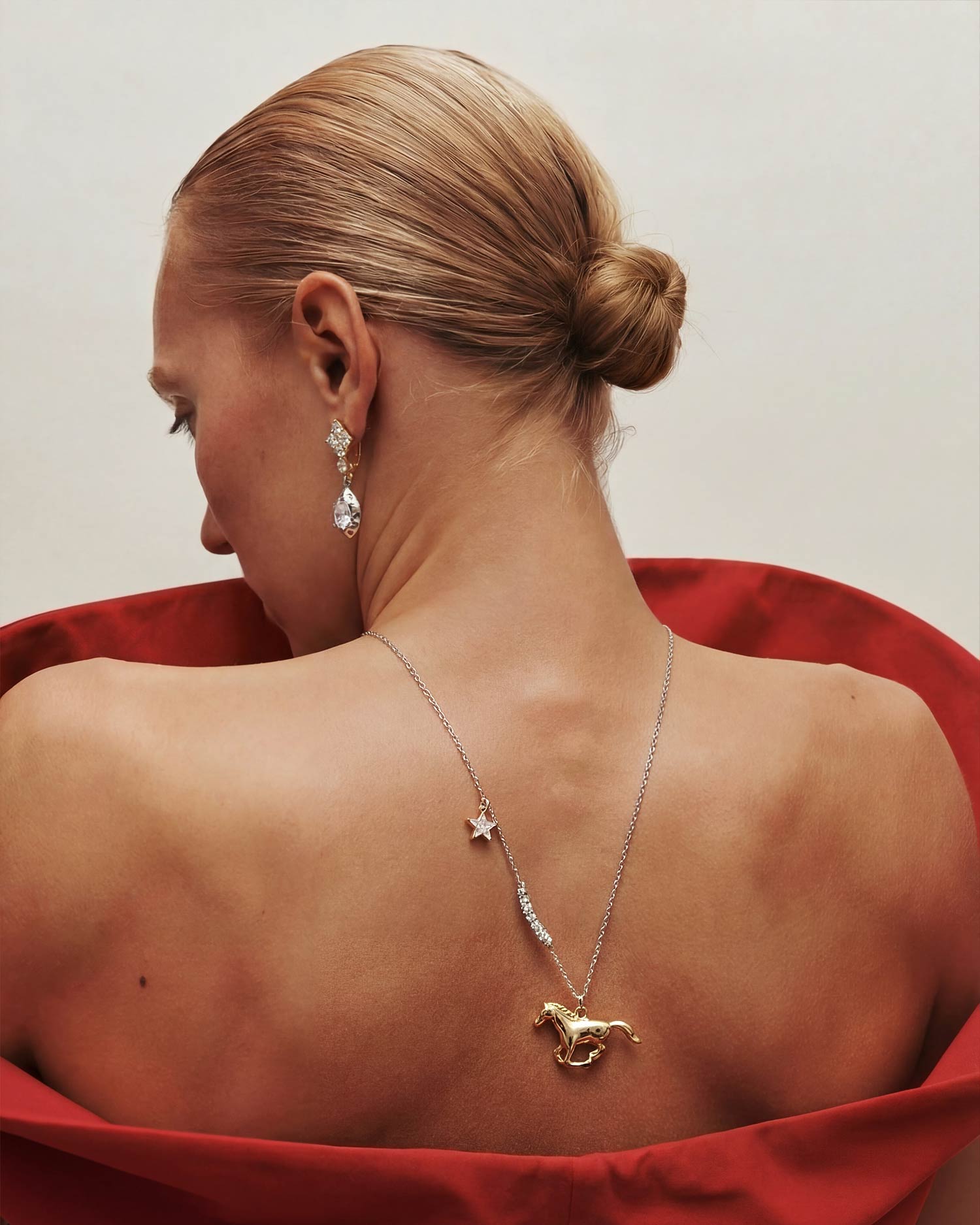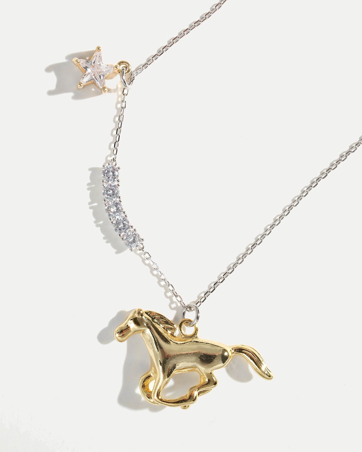 Колье с подвеской в виде лошади выполнено из ювелирного сплава, покрытого родием, чешского стекла, ювелирного сплава, покрытого 18К золотом, и фианитов.