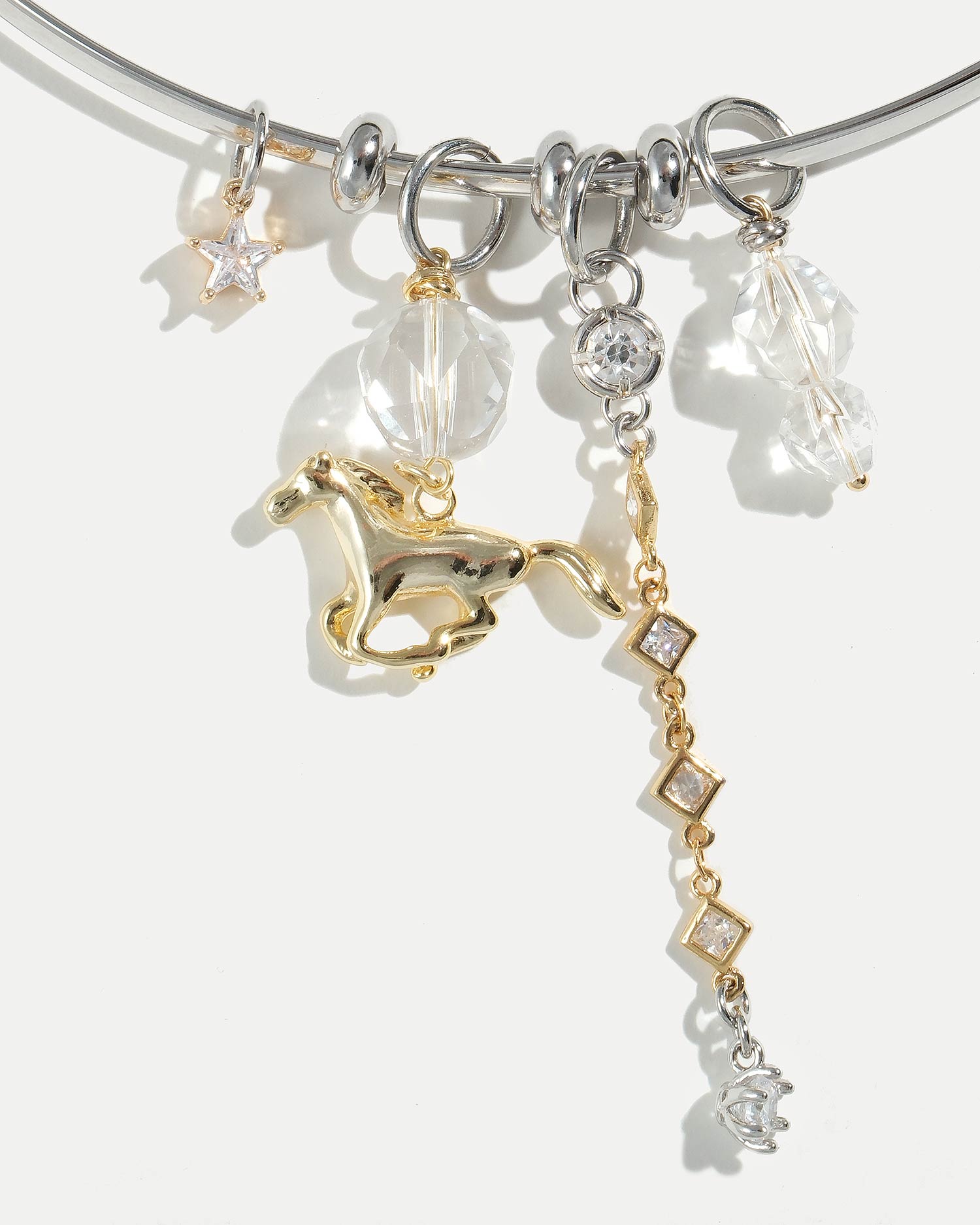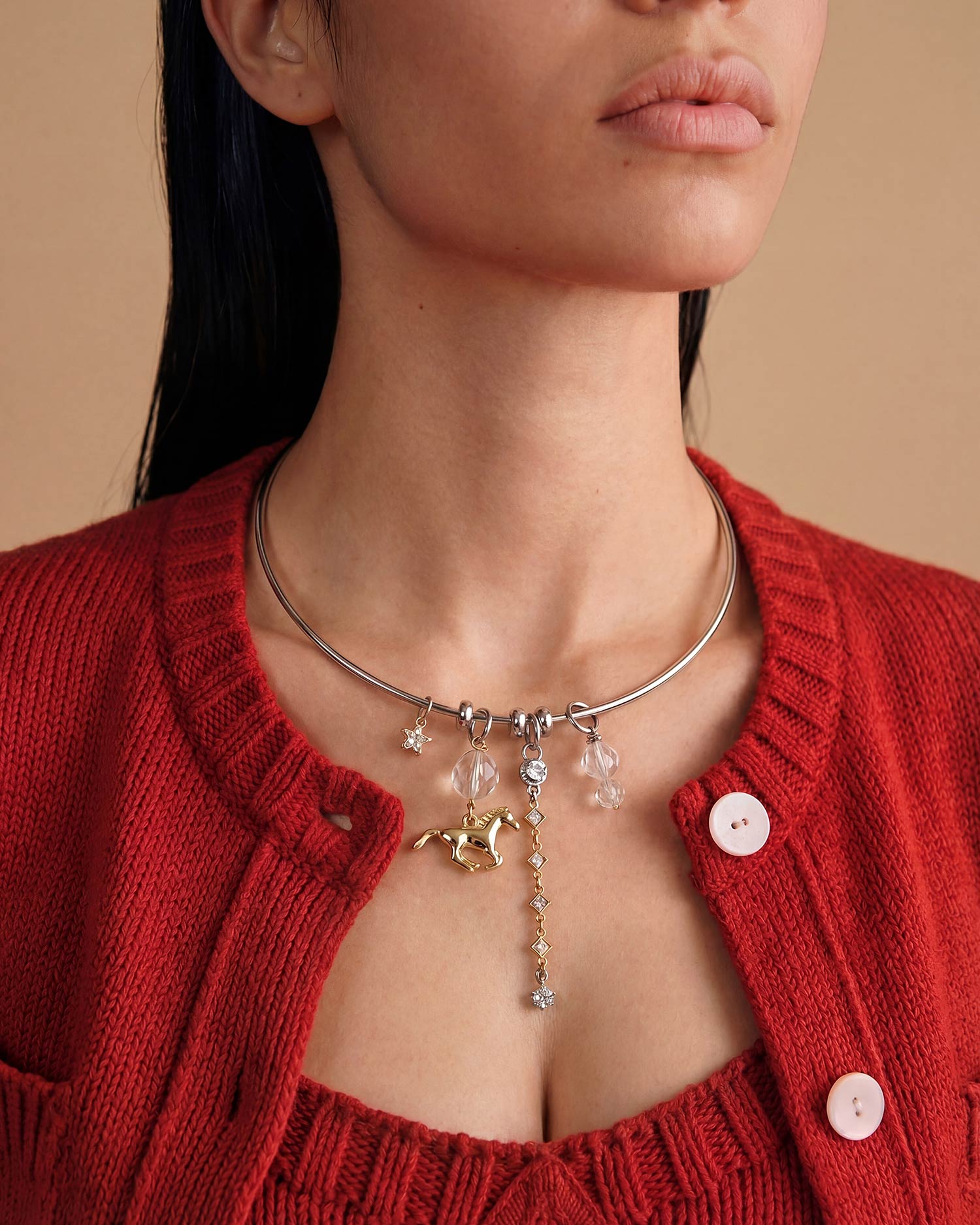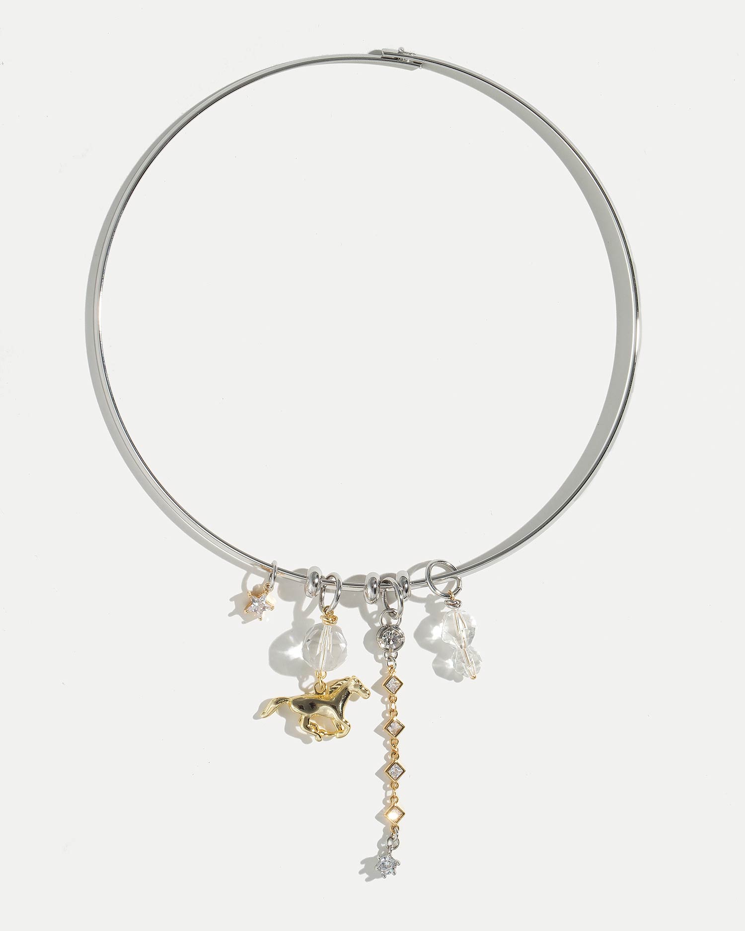 Колье с подвеской в виде лошади выполнено из ювелирного сплава, покрытого родием, чешского стекла, ювелирного сплава, покрытого 18К золотом, и фианитов.