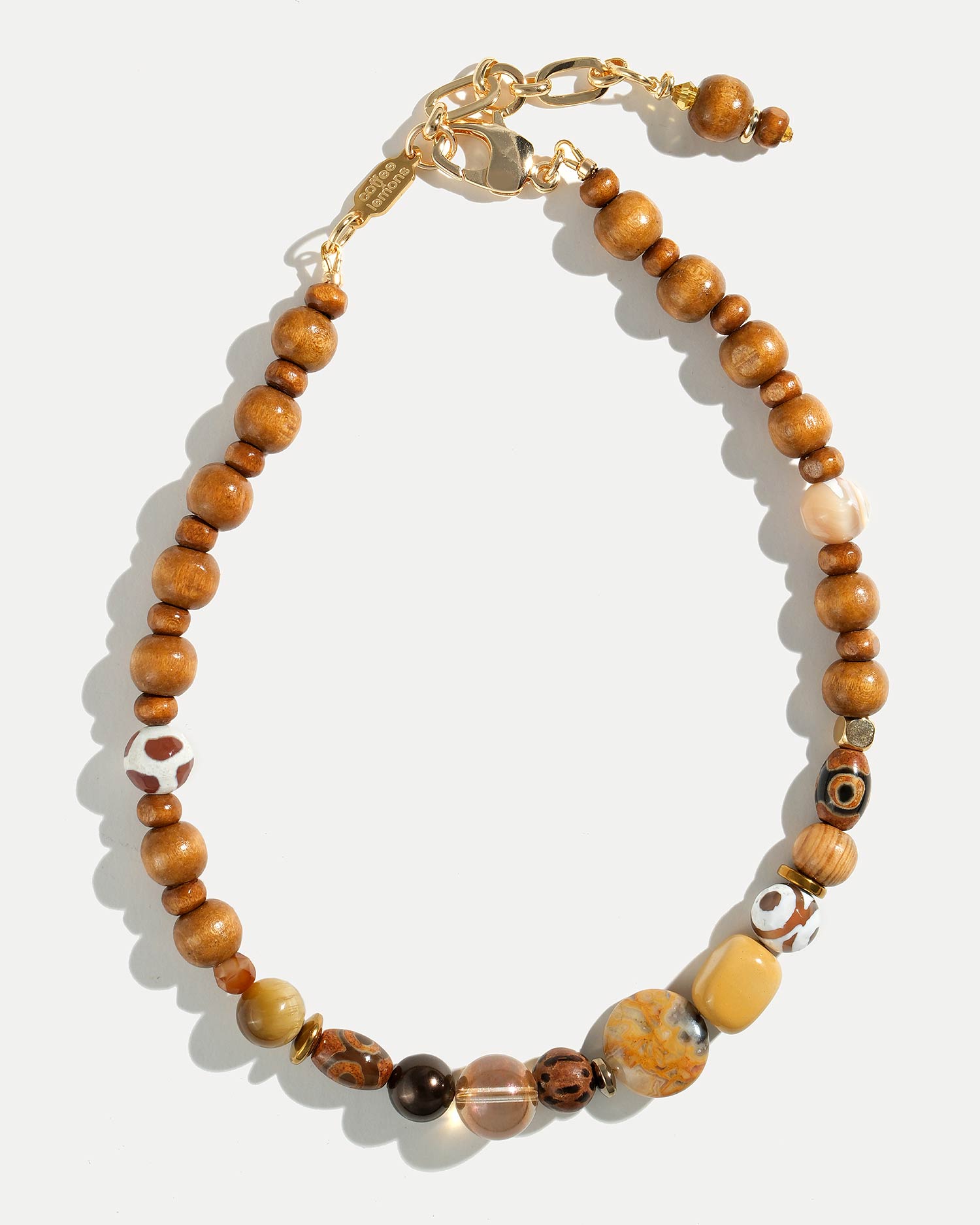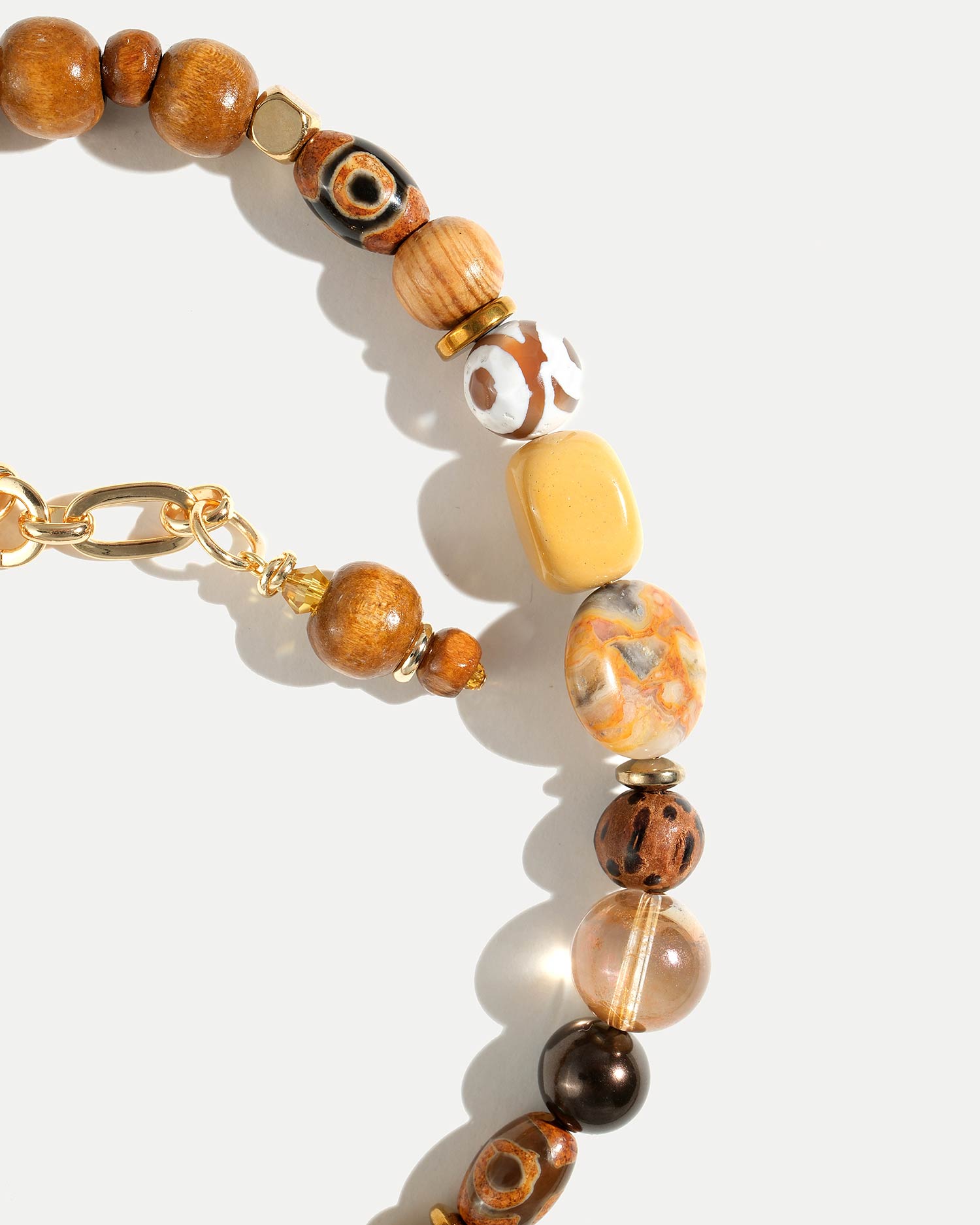 Колье выполнено из деревянных бусин, ювелирного сплава, покрытого 18К золотом, агата, чешского стекла, керамики, гематита, бакелита, камня кошачий глаз и перламутра.