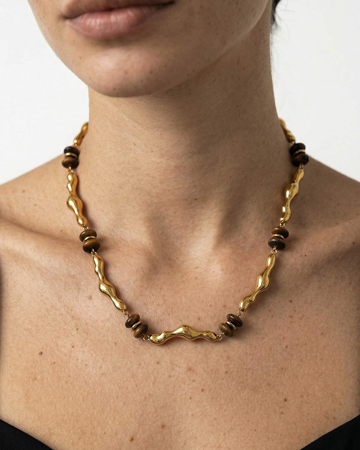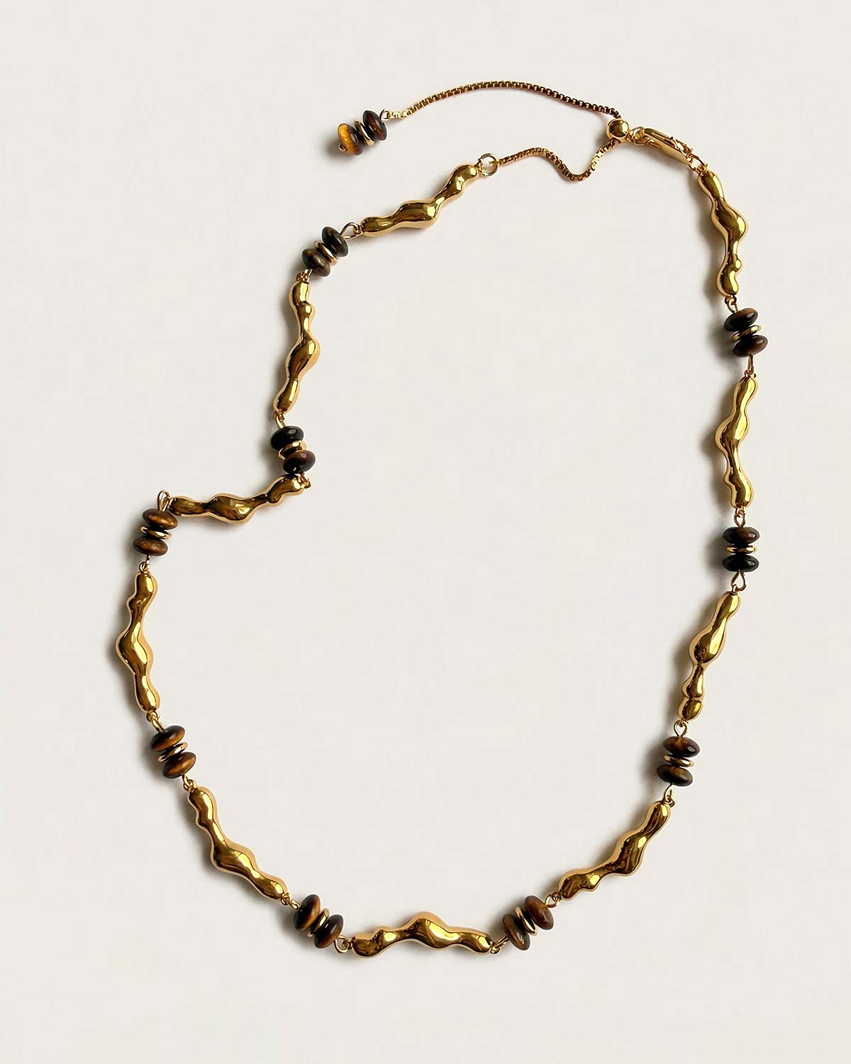 Колье выполнено из латуни в виде пластичных золотистых элементов со вставками из тигрового глаза. Украшение сочетает в себе этнический характер, природную теплоту и скульптурную эстетику. Текучая форма металлических звеньев создаёт ощущение живого ритма, а тигровый глаз добавляет глубину, мягкое сияние и благородный акцент.