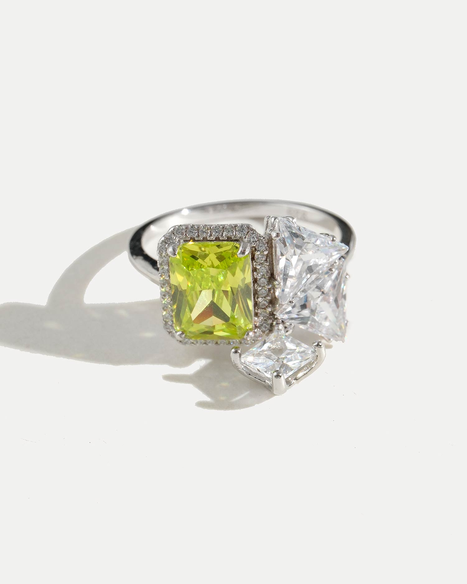 Кольцо выполнено из ювелирного сплава, покрытого родием, и фианитов.