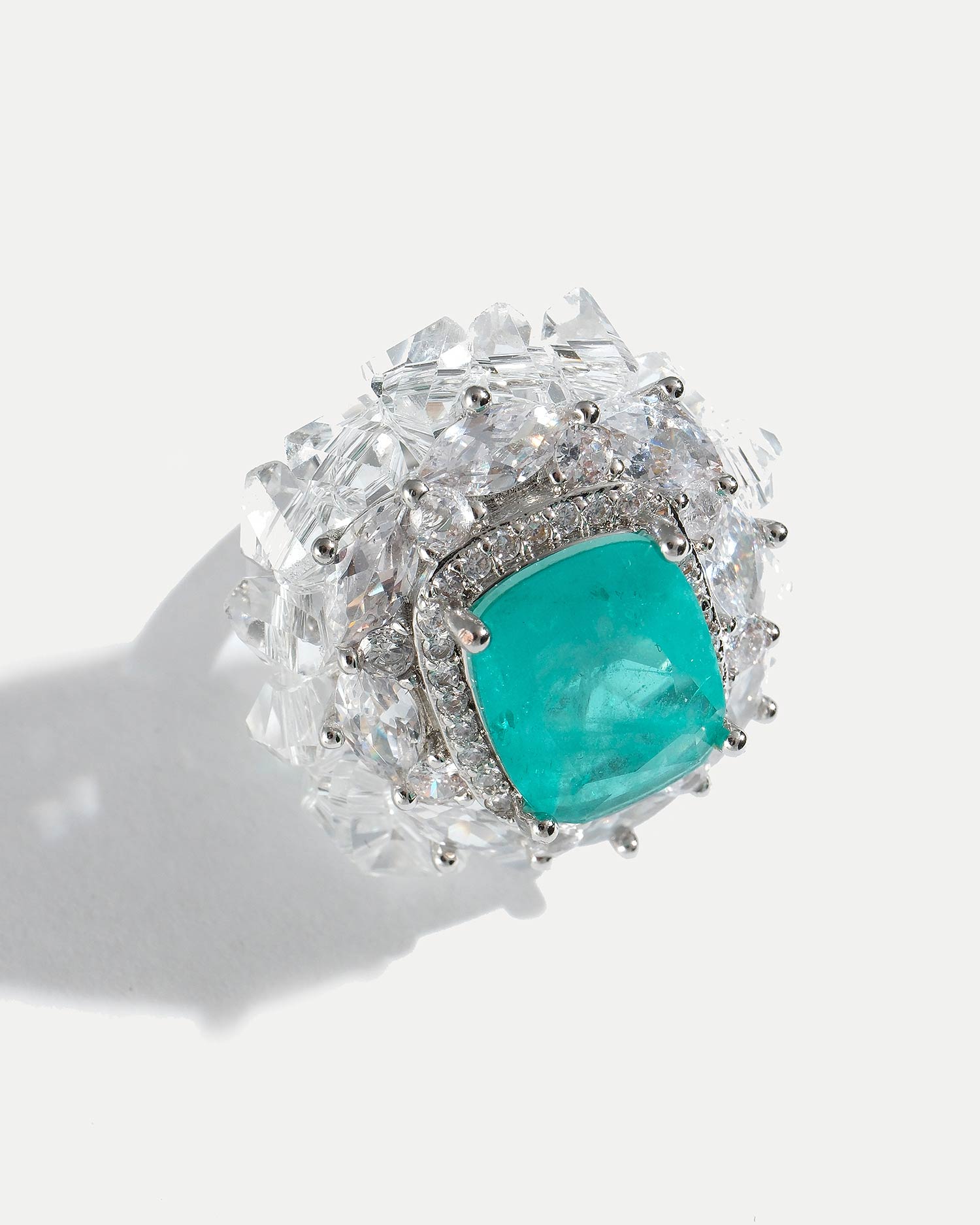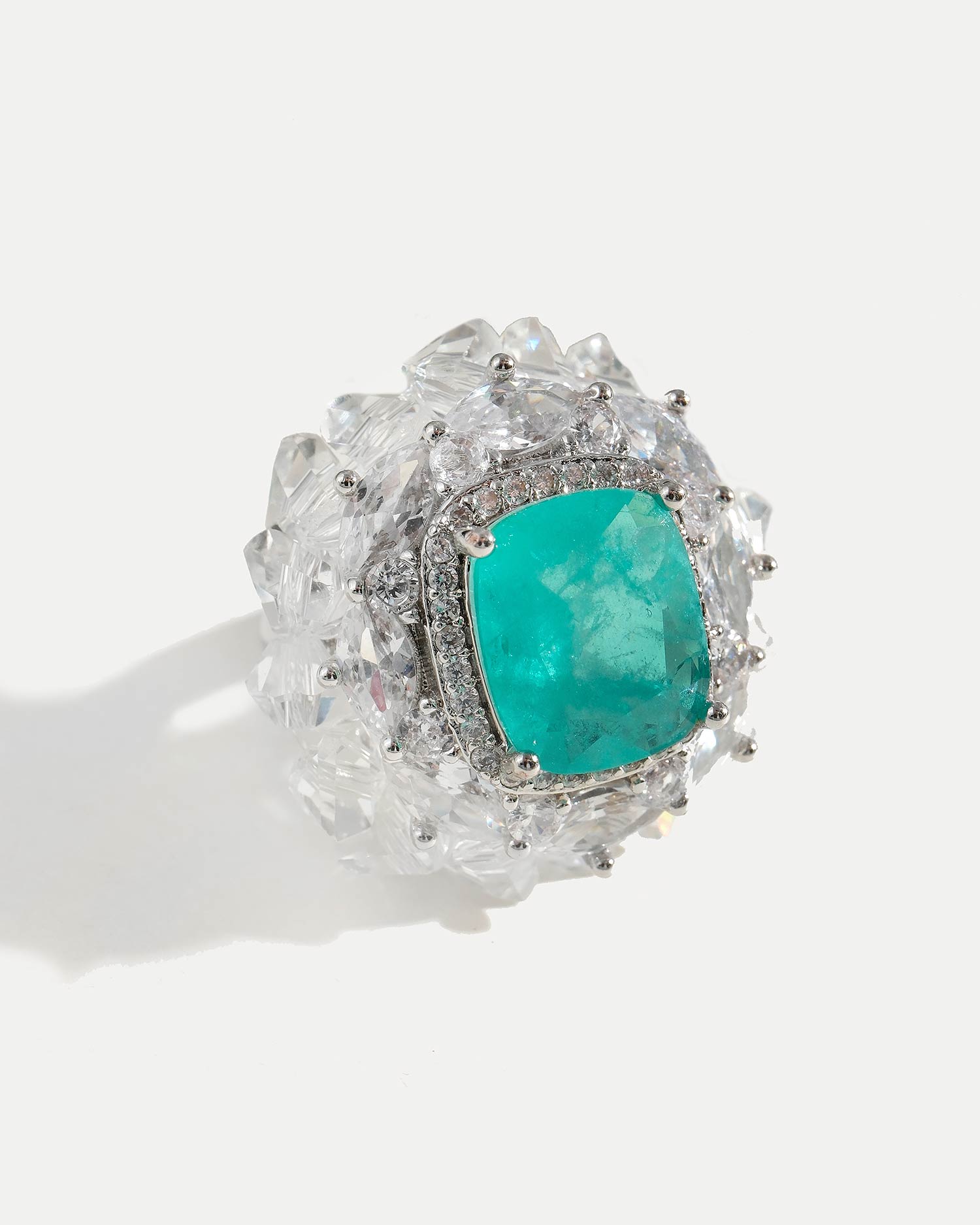 Кольцо выполнено из ювелирного сплава, покрытого родием, фианитов, люцита и чешского стекла.