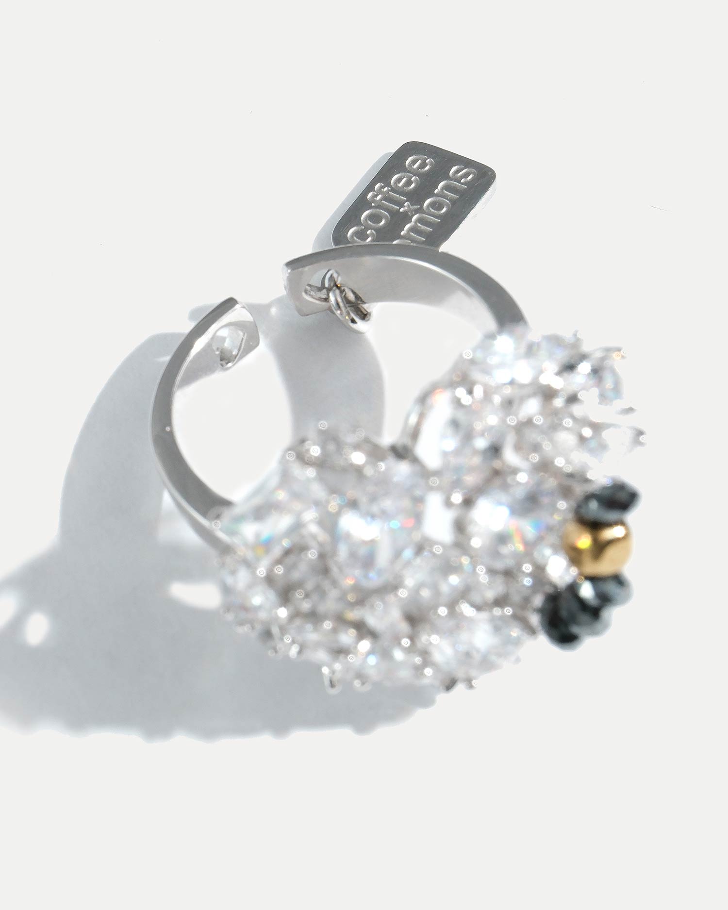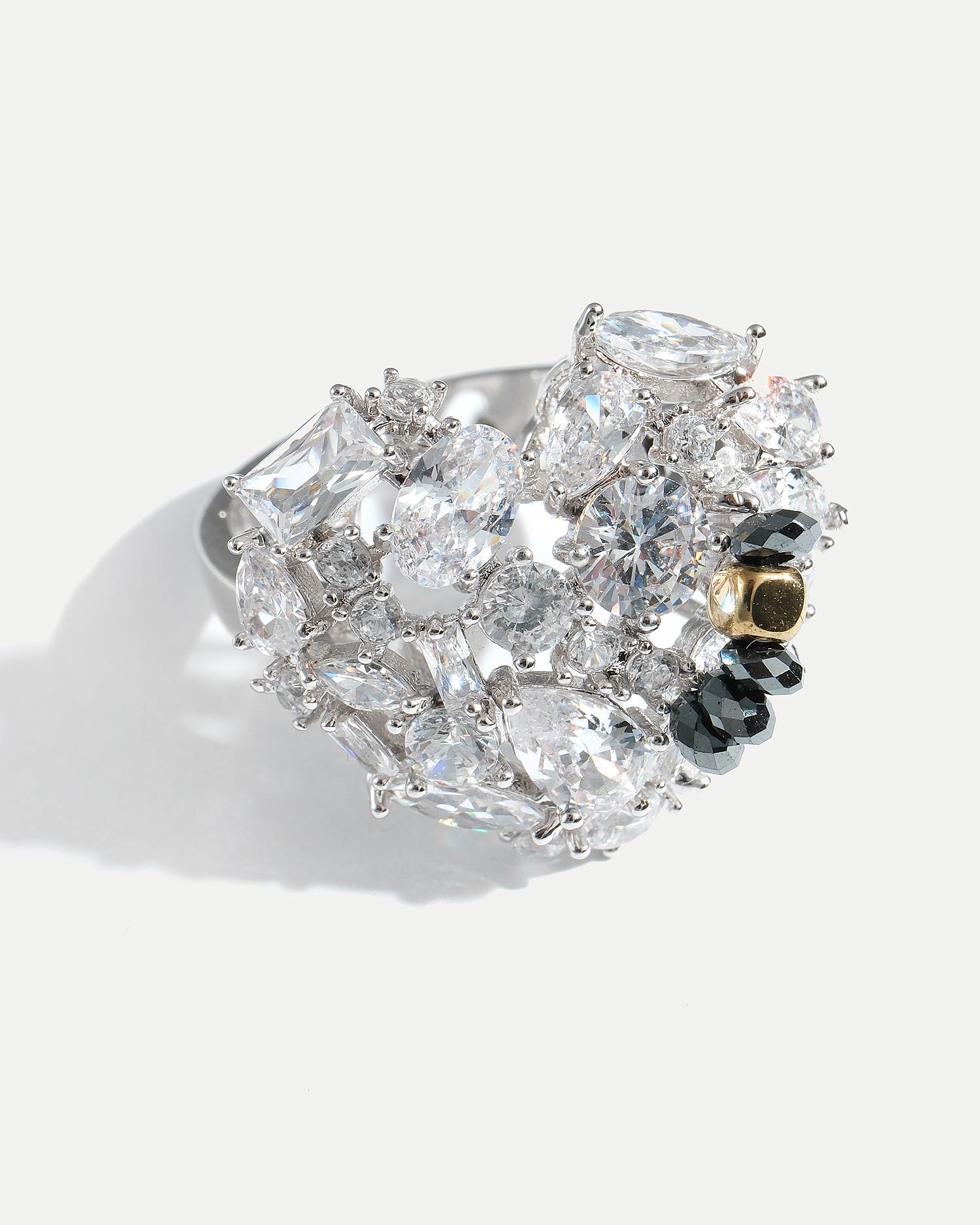Кольцо выполнено из ювелирного сплава, покрытого родием, фианитов и гематита.