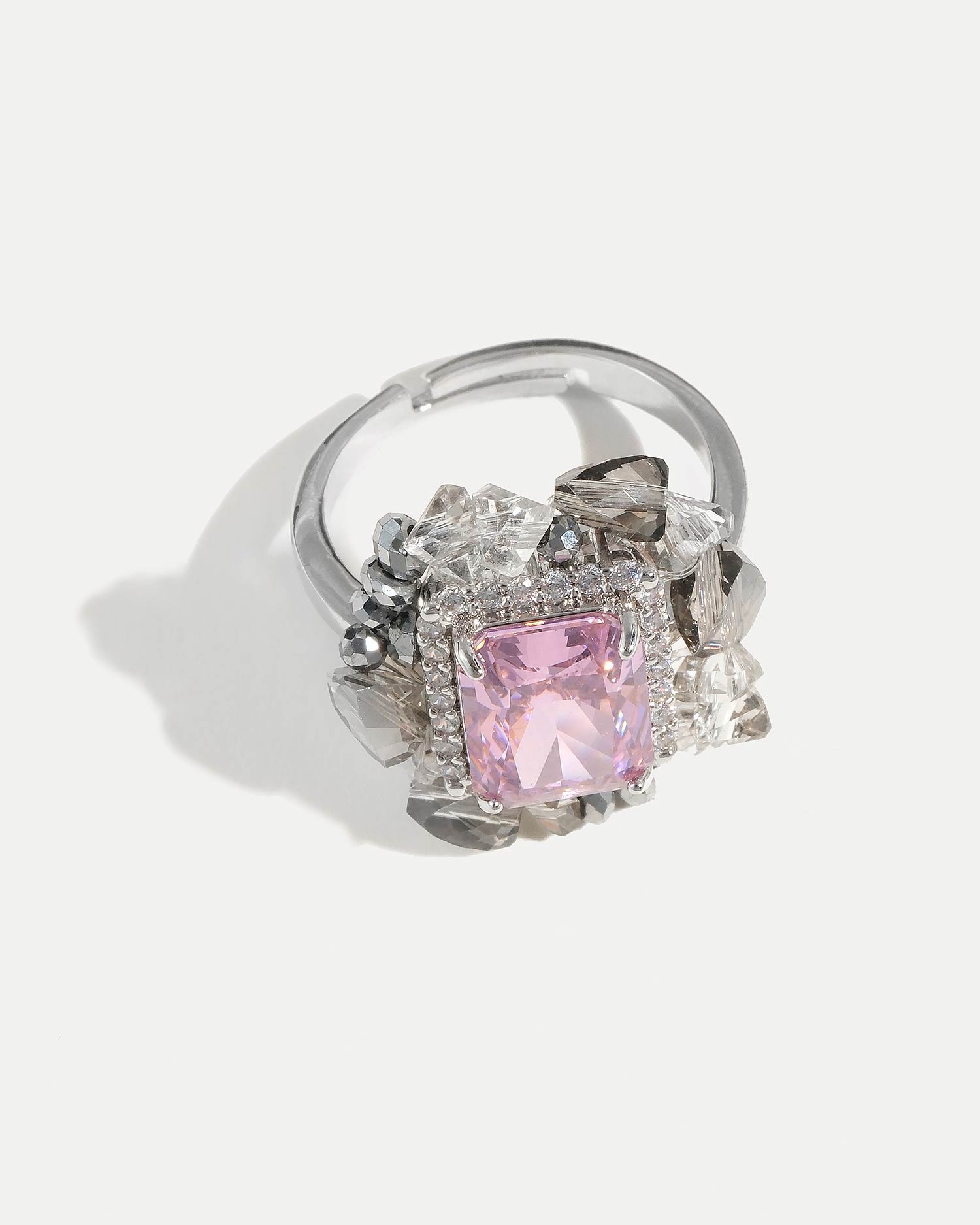 Кольцо выполнено из ювелирного сплава, покрытого родием, фианитов, чешского стекла и гематита.