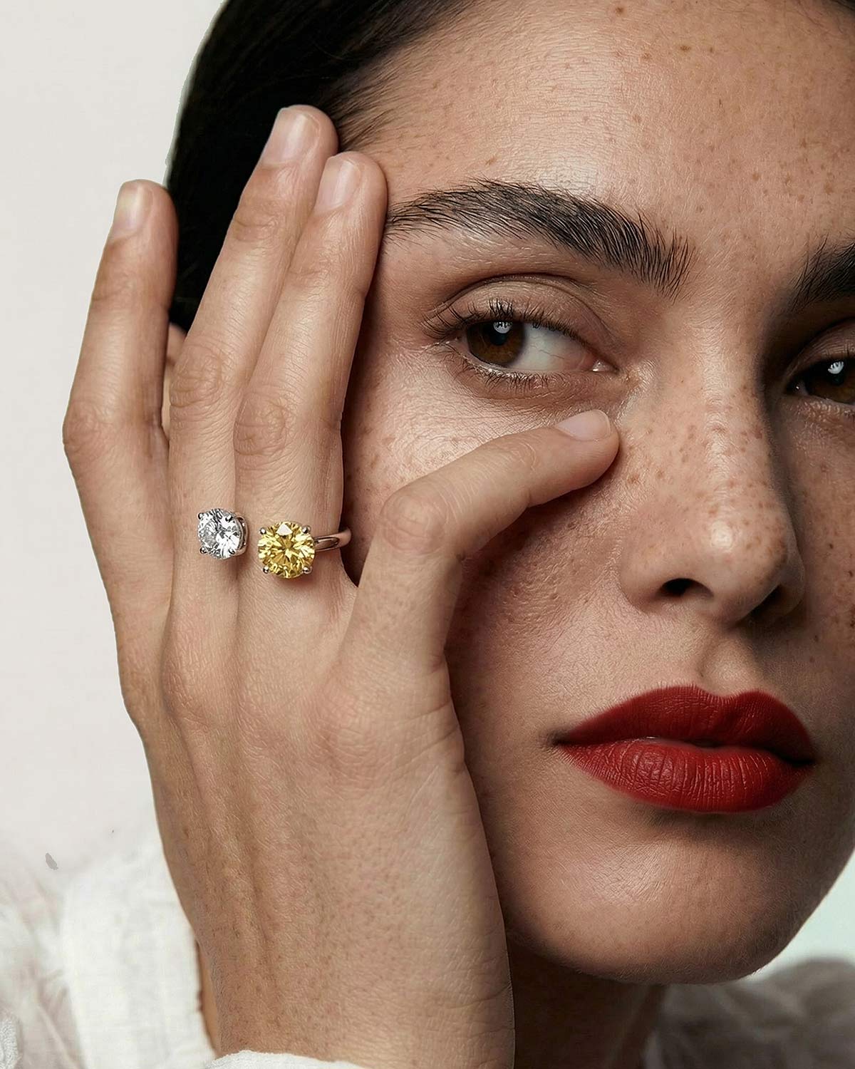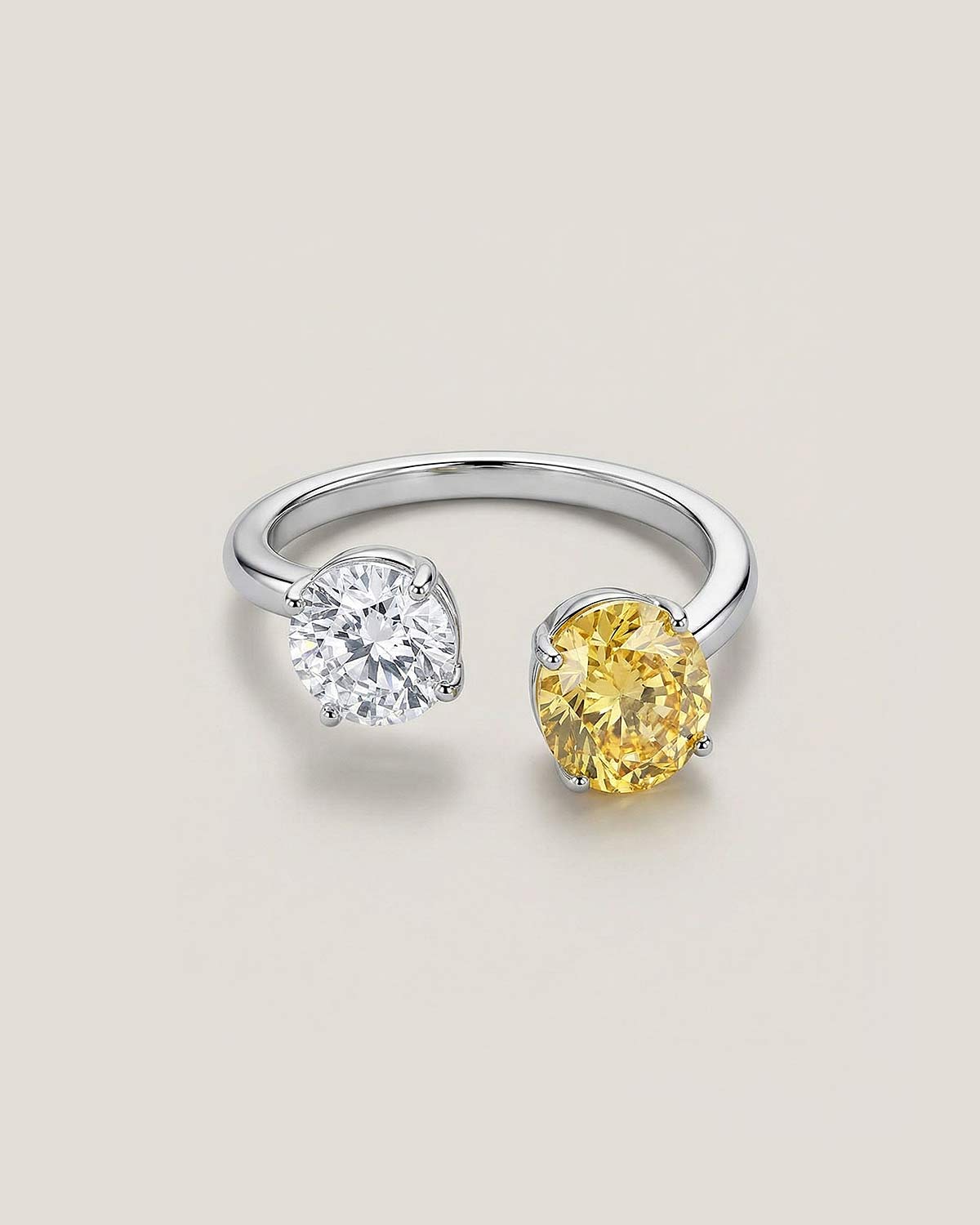 Серебристое кольцо из ювелирного сплава, покрытое родием, с фианитами прозрачного и жёлтого оттенков.