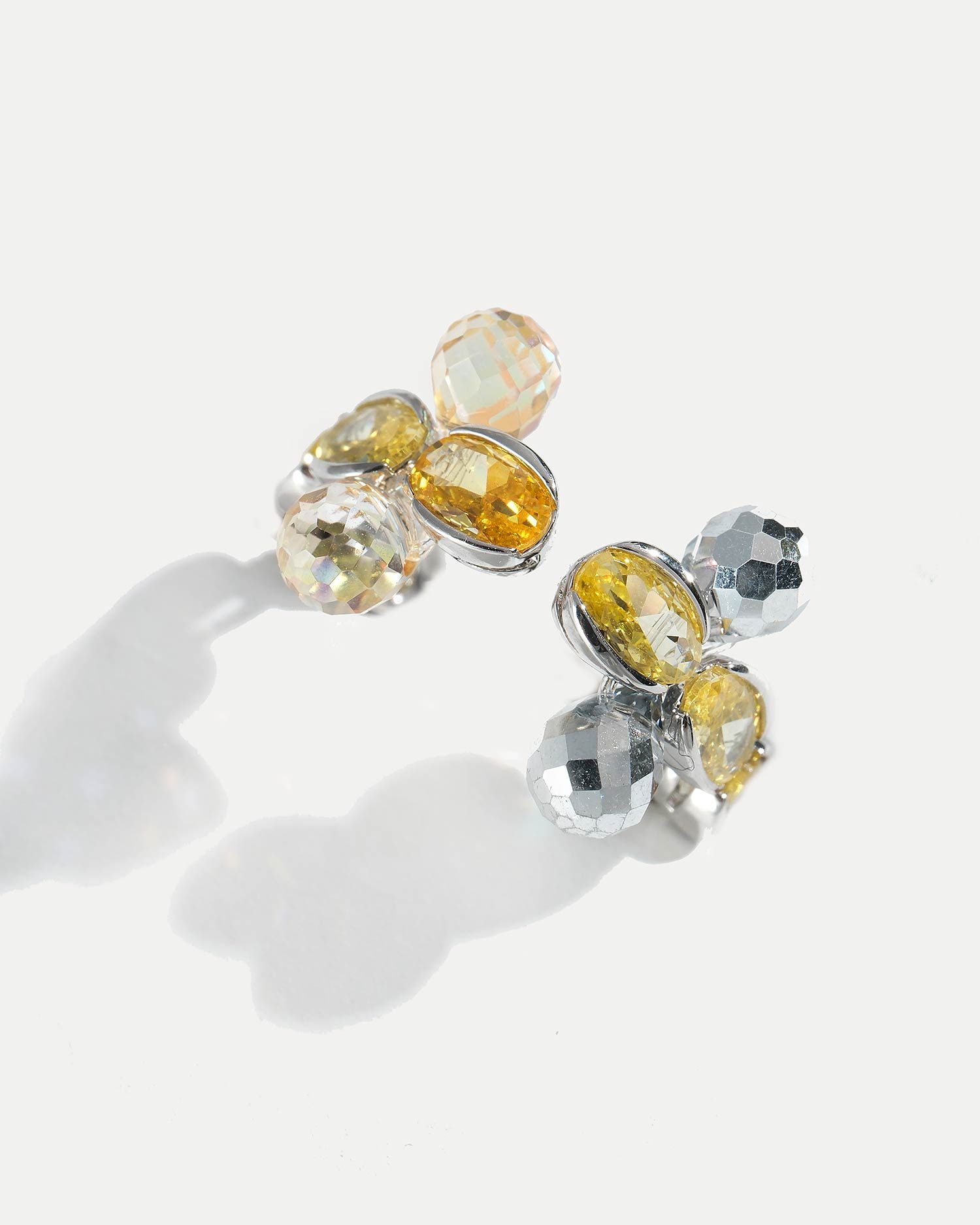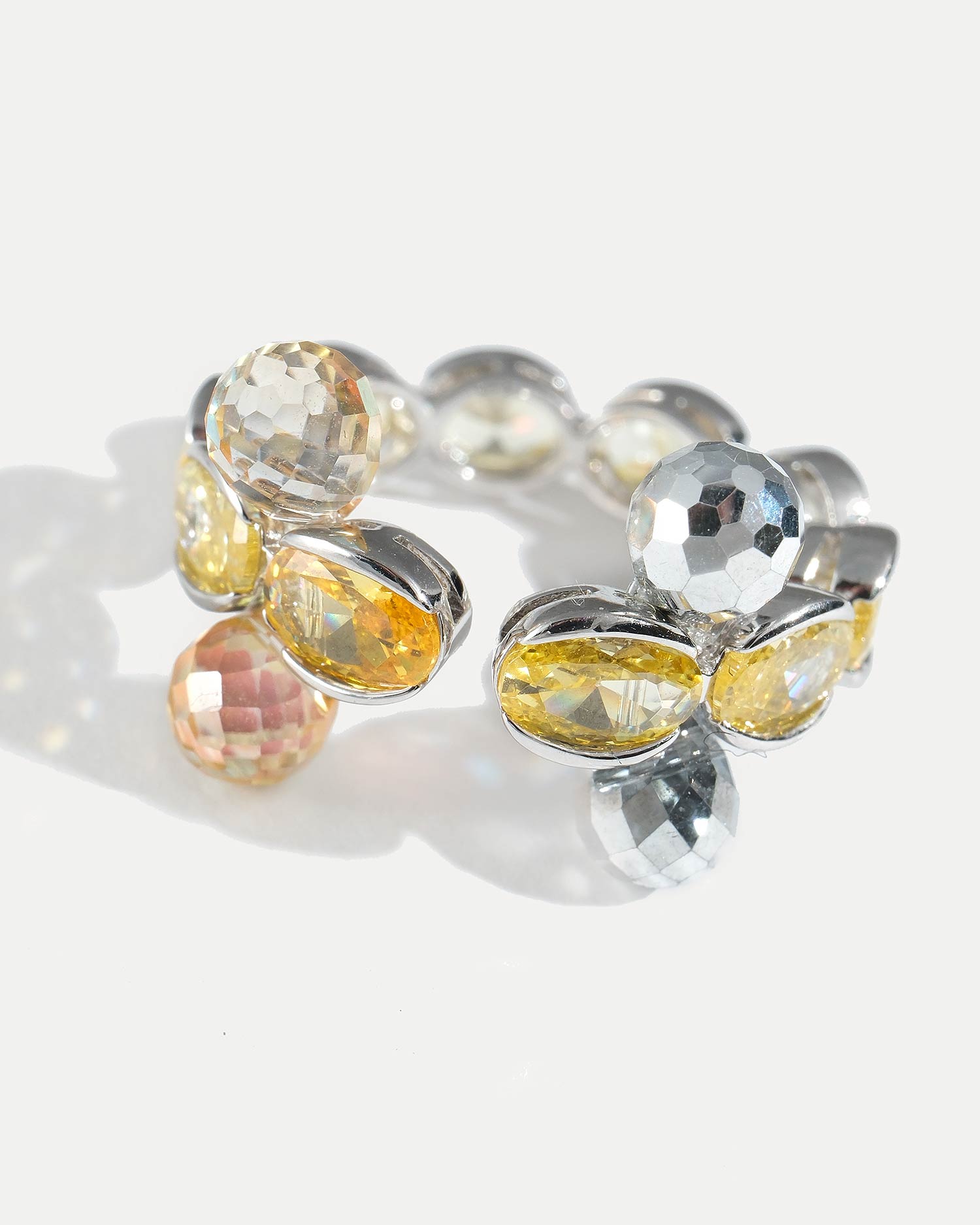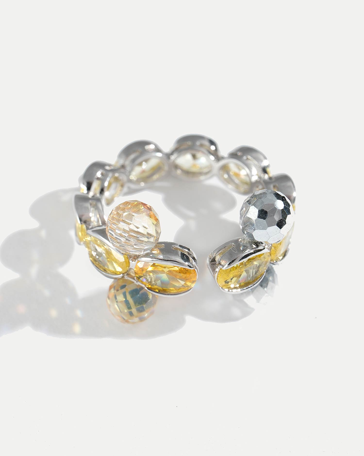 Кольцо выполнено из ювелирного сплава, покрытого родием, фианитов и чешского стекла.