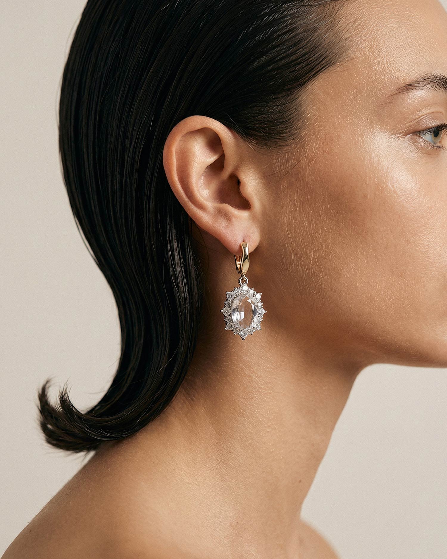 Серьги выполнены из ювелирного сплава, покрытого родием, чешского стекла, фианитов и ювелирного сплава, покрытого 18К золотом.